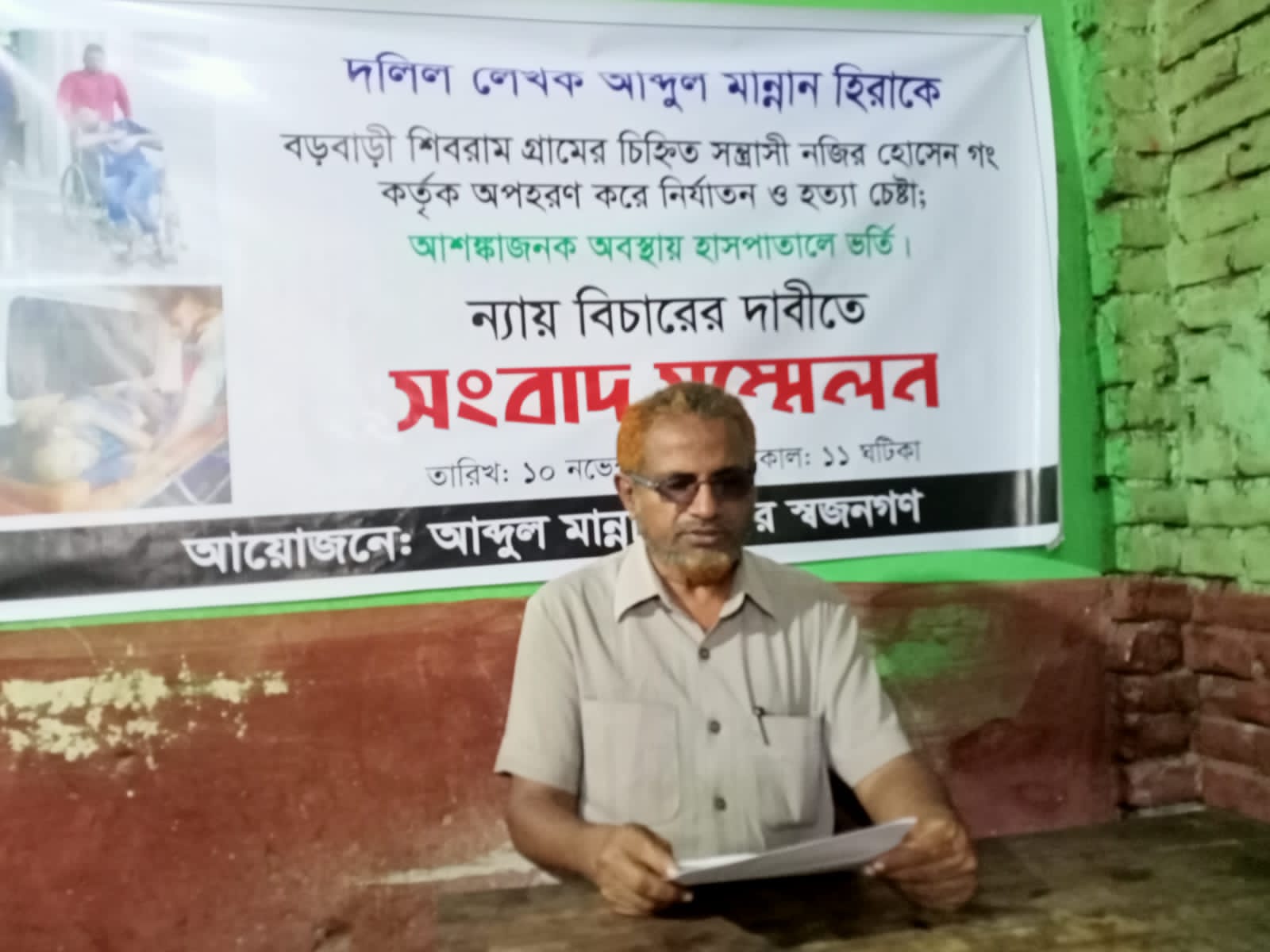 লালমনিরহাটে দলিল লেখক আব্দুল মান্নান হিরাকে বড়বাড়ী শিবরাম গ্রামের চিহ্নিত সন্ত্রাসী নজির হোসেন গং কর্তৃক অপহরণ করে নির্যাতন ও হত্যা চেষ্টা; আশঙ্কাজনক অবস্থায় হাসপাতালে ভর্তি ন্যায় বিচারের দাবীতে সংবাদ সম্মেলत অনুষ্ঠিত হয়েছে।