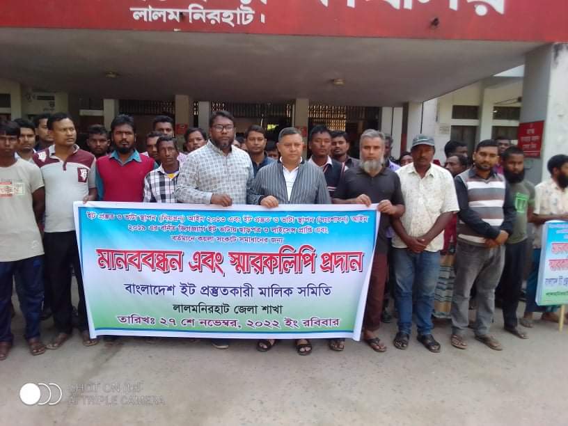 রোববার (২৭ নভেম্বর) সকাল ১১টায় লালমনিরহাট জেলা প্রশসাকের কার্যালয় চত্ত্বরে বাংলাদেশ ইট প্রস্তুতকারী মালিক সমিতি লালমনিরহাট জেলা শাখার আয়োজনে এ ঘন্টাব্যাপী ওই মানববন্ধন অনুষ্ঠিত হয়।