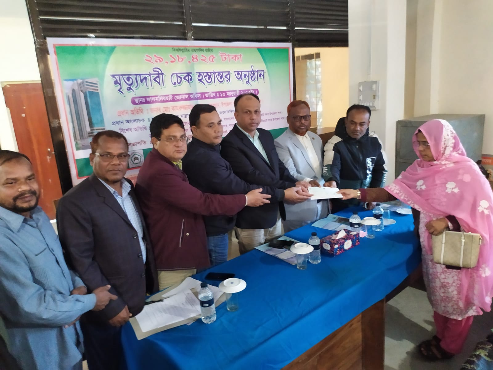 ফারইষ্ট ইসলামী লাইফ ইন্স্যুরেন্স কোং লিমিটেডের গ্রাহক লালমনিরহাট জেলা শহরের কালীবাড়ী এলাকার মরহুম হারুন অর রশিদের মৃতুদাবী চেক হস্তান্তর অনুষ্ঠান অনুষ্ঠিত হয়েছে।