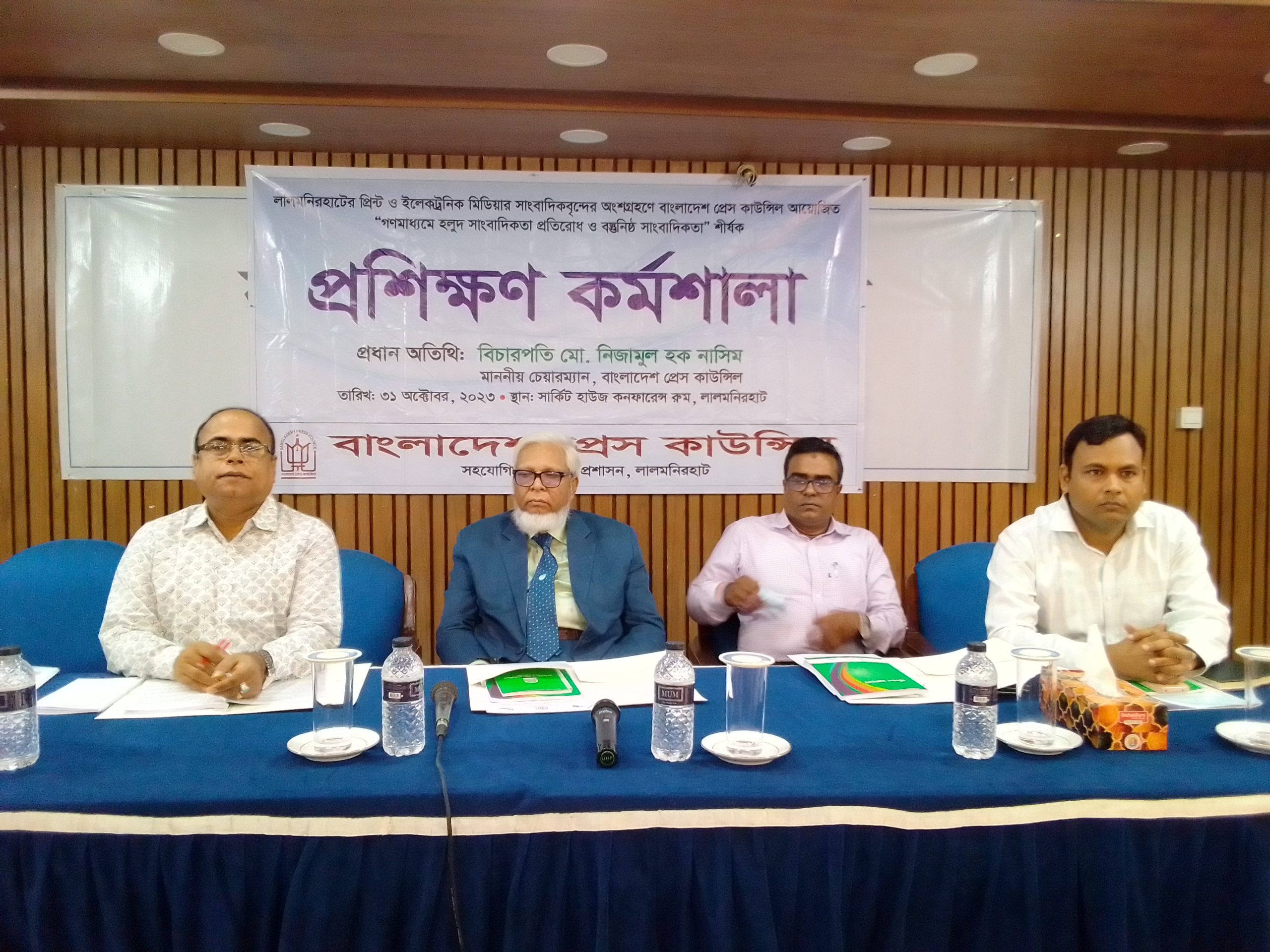 লালমনিরহাট অতিরিক্ত জেলা প্রশাসক (রাজস্ব) টি. এম. এ. মমিন-এঁর সভাপতিত্বে প্রধান অতিথি ছিলেন বাংলাদেশ প্রেস কাউন্সিলের চেয়ারম্যান বিচারপতি মোঃ নিজামুল হক নাসিম। রিসোর্স পার্সন ছিলেন বাংলাদেশ প্রেস কাউন্সিলের সচিব (অতিরিক্ত সচিব) শ্যামল চন্দ্র কর্মকার। বক্তব্য রাখেন লালমনিরহাট জেলা তথ্য অফিসার মোঃ মামুন অর রশীদ প্রমুখ। এ প্রশিক্ষণ কর্মশালায় লালমনিরহাট জেলার প্রিন্ট ও ইলেকট্রনিক মিডিয়ার সংবাদকর্মি অংশ নিয়েছে।