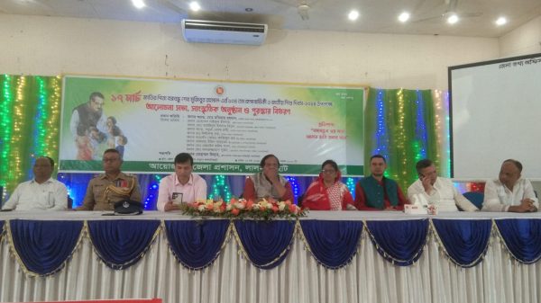 রোববার (১৭ মার্চ) লালমনিরহাট জেলা পরিষদ অডিটোরিয়াম কাম কমিউনিটি সেন্টার মিলনায়তনে লালমনিরহাট জেলা প্রশাসনের আয়োজনে এ আলোচনা সভা, সাংস্কৃতিক অনুষ্ঠান ও পুরস্কার বিতরণ অনুষ্ঠান অনুষ্ঠিত হয়।