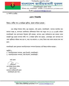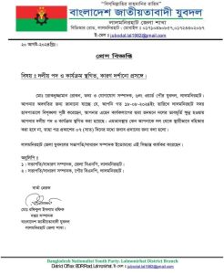 মঙ্গলবার (২০ আগস্ট) বাংলাদেশ জাতীয়তাবাদী যুবদল লালমনিরহাট জেলা শাখার এই সিদ্ধান্ত মোতাবেক বাংলাদেশ জাতীয়তাবাদী যুবদল লালমনিরহাট জেলা শাখার দপ্তর সম্পাদক মোঃ রফিকুল ইসলাম রফিক স্বাক্ষরিত এক প্রেস বিজ্ঞপ্তিতে তাদেরকে দলীয় পদ ও কার্যক্রম স্থগিত, কারণ দর্শানোর পত্র প্রদান করা হয়।