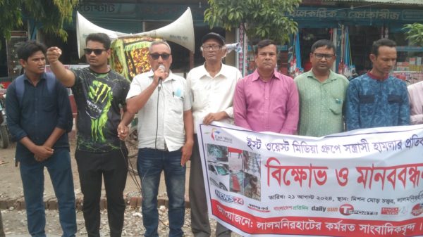 লালমনিরহাটে ইস্ট ওয়েস্ট মিডিয়া গ্রুপে সন্ত্রাসী হামলার প্রতিবাদে বিক্ষোভ ও মানববন্ধন অনুষ্ঠিত হয়েছে।