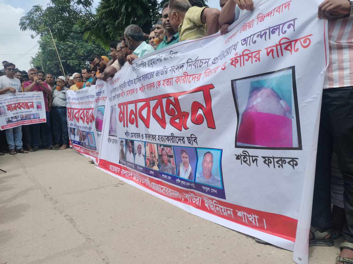 মানববন্ধনে অংশ নেওয়া ব্যক্তিরা বক্তব্যে দাবি করেন, ২০১৪ সালের ৫ জানুয়ারির নির্বাচনে বাউরা ইউনিয়নের সফিরহাটে স্বেচ্ছাসেবক দলের নেতা মোবারক হোসেন ও ফারুক হোসেন পিটিয়ে এবং ছুরিকাঘাতে নির্মমভাবে হত্যা করা হয়। ওই সময় নিহতের স্বজনদের করা ২টি মামলায় ৮৭জনসহ অজ্ঞাতনামা ব্যক্তিদেরকে আসামী করা হয়। পরবর্তীতে পুলিশ প্রকৃত দোষী ব্যক্তিদের বাদ দিয়ে মাত্র ৯জনকে রাখে। বর্তমান পরিবর্তিত সময়ে ওই সময়ের হত্যাকাণ্ডে জড়িত ব্যক্তিদের আইনের আওতায় আনতে পূণরায় মামলা গ্রহণ ও পুনঃতদন্ত করে দোষীদের দৃষ্টান্তমূলক শাস্তির দাবি করা হয়।