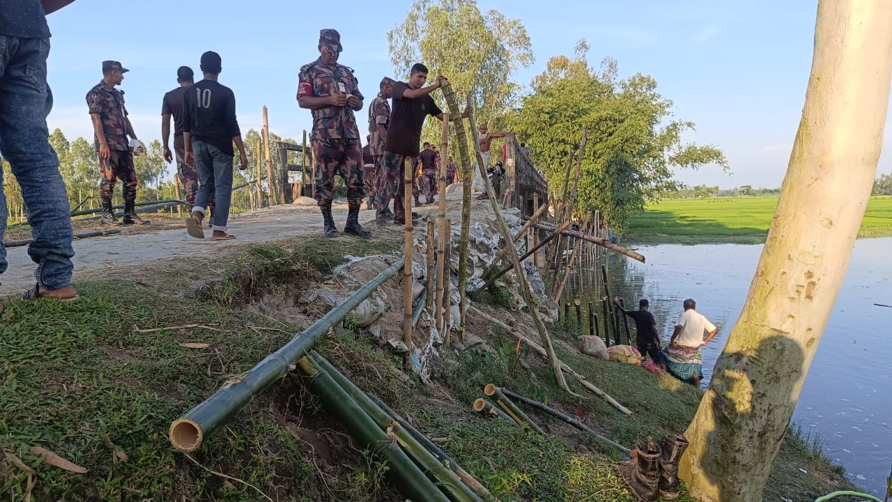 বিজিবি সূত্র জানায়, উপজেলার জোংড়া ইউনিয়নের ৫নং ওয়ার্ডের ধরলা নদীর নিকটবর্তী জোড়া ব্রিজ এর উভয় পার্শ্বের এ্যাপ্রোচ সড়কের মাটি গেলো বন্যার পানির স্রোতে ধ্বসে যায়। স্রোতে ব্রিজের পার্শ্ববর্তী প্রায় ১২০ ফুট দীর্ঘ অংশ ভেঙ্গে রাস্তাটি যাতায়াতের অনুপযোগী হয়ে পড়ে। ফলে সকল প্রকার যানবাহন চলাচলসহ ১০টি পাড়া-মহল্লার প্রায় ১০ থেকে ১২হাজার সাধারণ মানুষ ও শিক্ষা প্রতিষ্ঠানের শিক্ষার্থীদের যাতায়াতে ভোগান্তি তৈরি হয়। জরুরী মূহুর্তে রোগী আনা-নেওয়ার ক্ষেত্রে দূর্ভোগে পড়েন এলাকাবাসী।