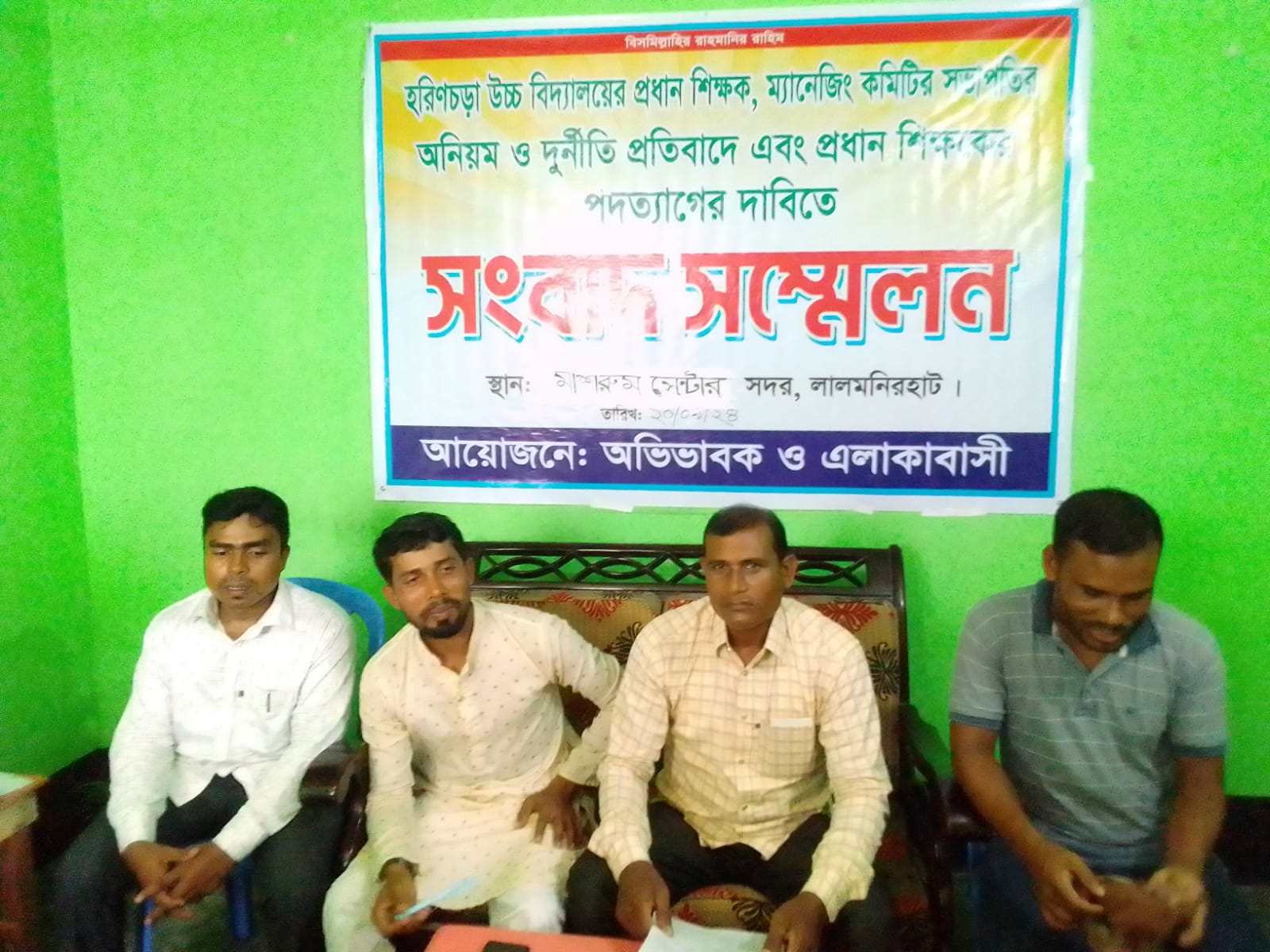 লালমনিরহাটের হরিণচড়া উচ্চ বিদ্যালয়ের প্রধান শিক্ষক, ম্যানেজিং কমিটির সভাপতির অনিয়ম ও দুর্নীতির প্রতিবাদে এবং প্রধান শিক্ষকের পদত্যাগের দাবিতে সংবাদ সম্মেলন অনুষ্ঠিত হয়েছে।