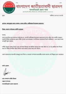 গত বুধবার (২৫ সেপ্টেম্বর) বাংলাদেশ জাতীয়তাবাদী ছাত্রদল লালমনিরহাট জেলা শাখার এই সিদ্ধান্ত মোতাবেক লালমনিরহাট জেলা ছাত্রদলের দপ্তর সম্পাদক মোঃ ফজলে রাব্বি বিজয় স্বাক্ষরিত এক পত্রে তাকে কারণ দর্শানোর নোটিশ দেয়া হয়।