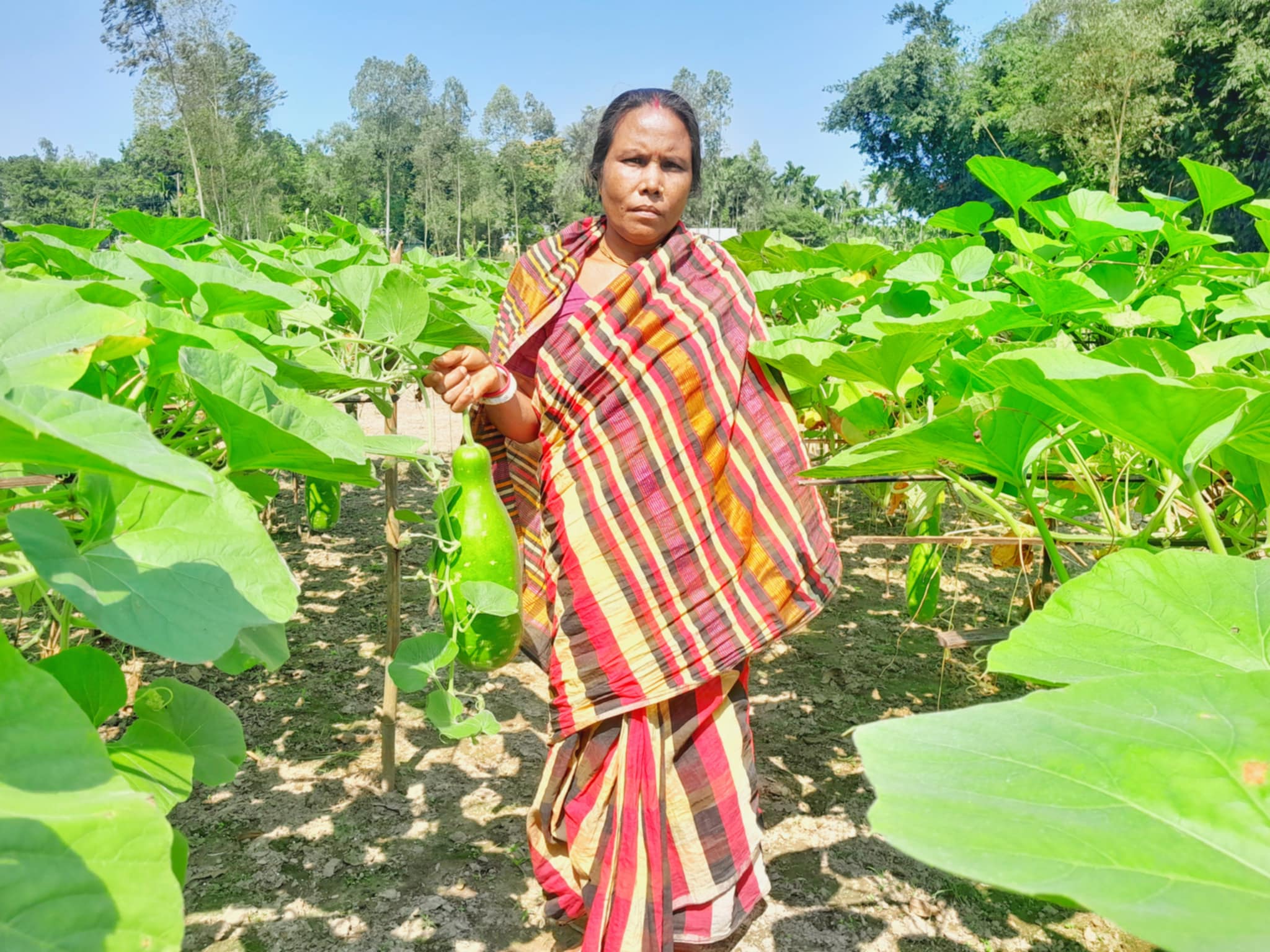 বাড়ির পিছনে পরিত্যাক্ত ৭শতাংশ জায়গায় লাউ চাষ করে সফল হয়েছে কৃষাণী রতনা রাণী রায় (৪৭)।