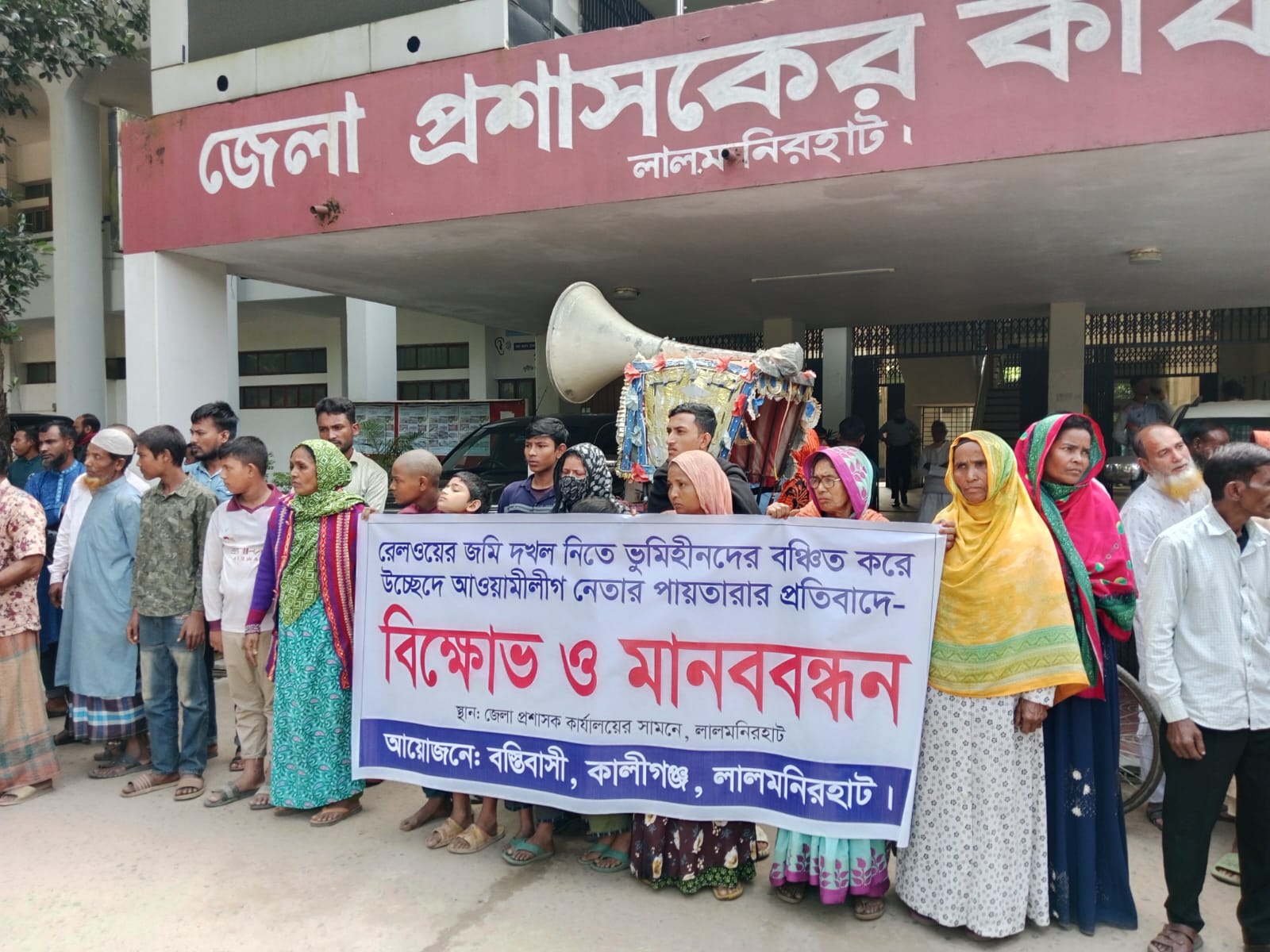 রোববার (১৭ নভেম্বর) সকাল ১১টায় লালমনিরহাট জেলা প্রশাসকের কার্যালয় চত্বরে লালমনিরহাটের কালীগঞ্জ বস্তিবাসীর আয়োজনে এ বিক্ষোভ ও মানববন্ধন অনুষ্ঠিত হয়।