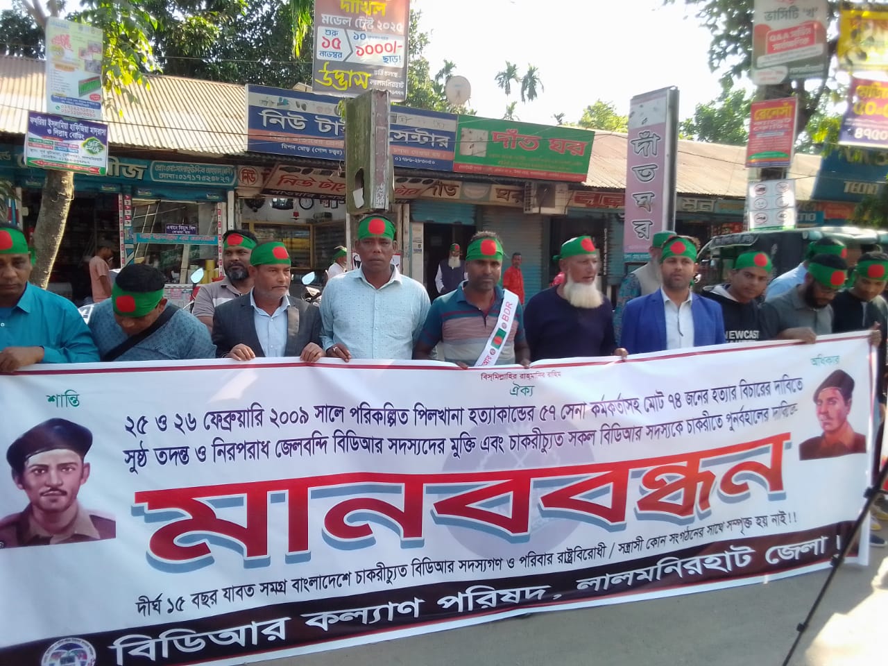 লালমনিরহাটে "শান্তি, ঐক্য, অধিকার" স্লোগান নিয়ে ২৫ ও ২৬ ফেব্রুয়ারি ২০০৯ সালে পরিকল্পিত পিলখানা হত্যাকান্ডের ৫৭ সেনা কর্মকর্তাসহ মোট ৭৪জনের হত্যার বিচারের দাবিতে সুষ্ঠ তদন্ত ও নিরপরাধ জেলবন্দি বিডিআর সদস্যদের মুক্তি এবং চাকরীচ্যুত সকল বিডিআর সদস্যকে চাকরীতে পুনর্বহালের দাবিতে- মানববন্ধন অনুষ্ঠিত হয়েছে।