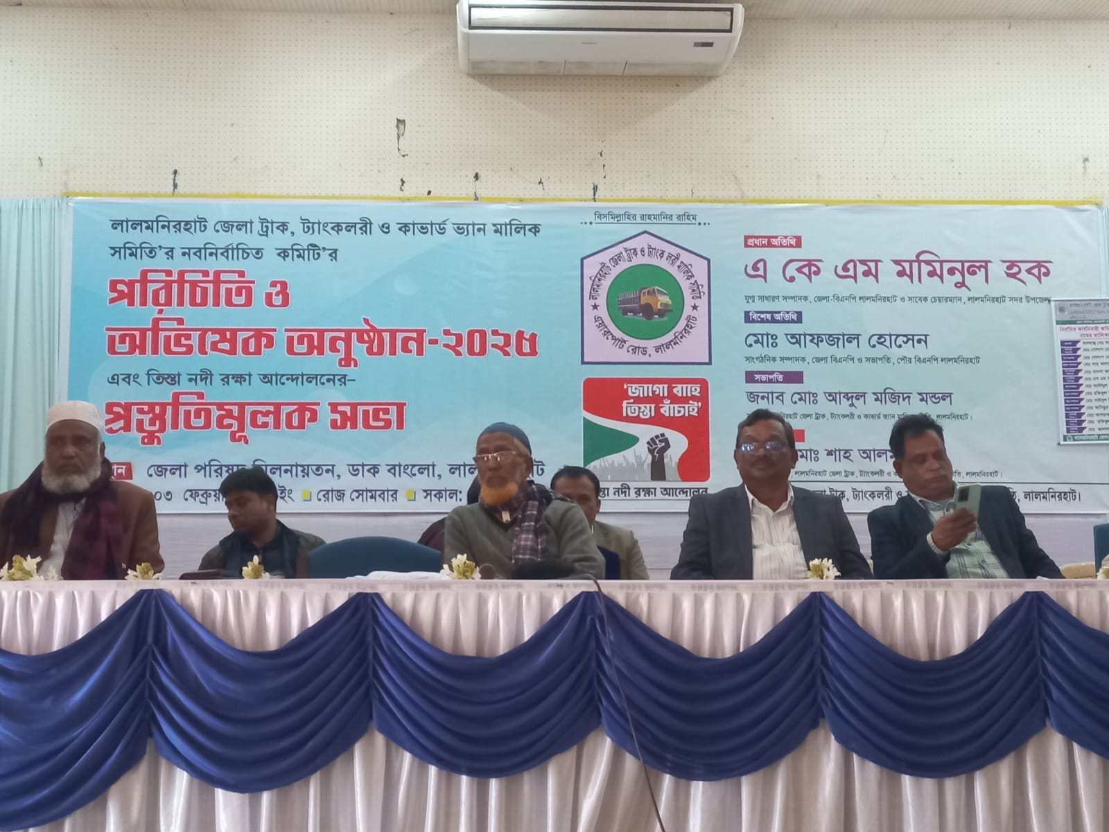 লালমনিরহাটে জেলা ট্রাক, ট্যাংকলরী ও কাভার্ড ভ্যান মালিক সমিতির নবনির্বাচিত কমিটির পরিচিতি ও অভিষেক অনুষ্ঠান-২০২৫ এবং তিস্তা নদী রক্ষা আন্দোলনের প্রস্তুতিমূলক সভা অনুষ্ঠিত হয়েছে।