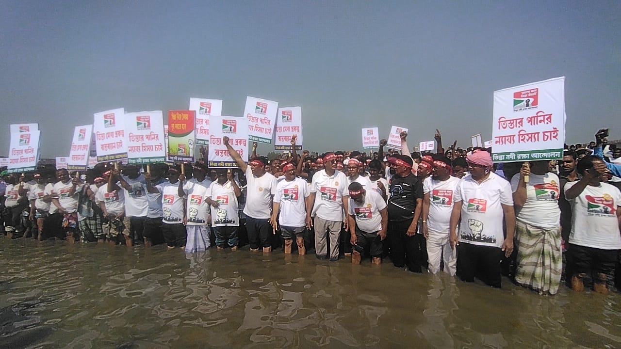 ভারতের পানি আগ্রাসনের বিরুদ্ধে এবং পানির নায্য হিস্যা ও তিস্তা মেগা প্রকল্প অবিলম্বে বাস্তবায়নের দাবিতে মৃত প্রায় তিস্তা নদীর হাঁটু পানিতে নেমে প্রতিবাদ জানিয়েছেন তিস্তা পাড়ের হাজার হাজার মানুষ।