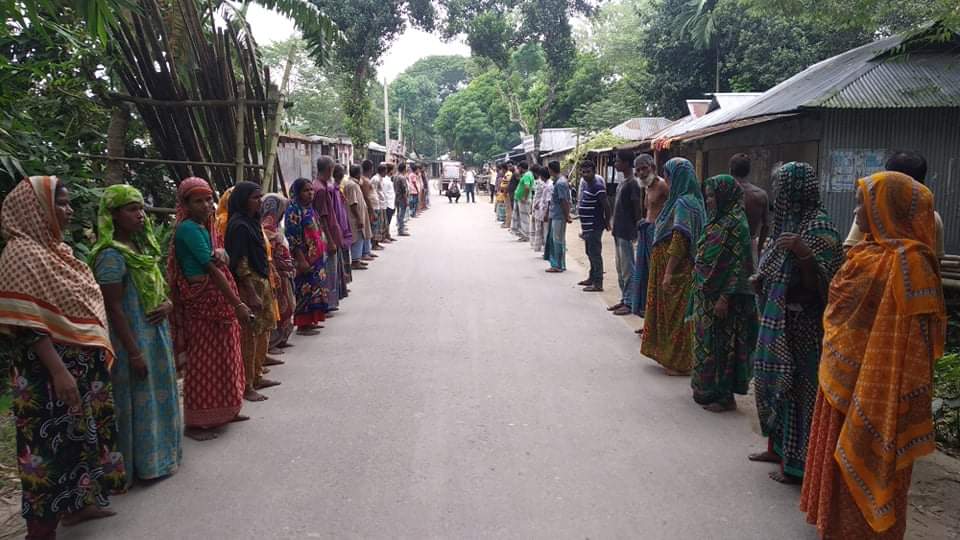 গতকাল রবিবার ৩০ আগস্ট দুপুর ১২টা থেকে ওই পুরান ভেলাবাড়ী বাজারের পাকা রাস্তার দুই ধারে দাঁড়িয়ে সামাজিক দূরত্ব বজায় রেখে অনুষ্ঠিত ঘন্টাব্যাপী এ মানববন্ধনে এলাকার ৩শতাধিক নারী-পুরুষ অংশগ্রহণ করেছেন।