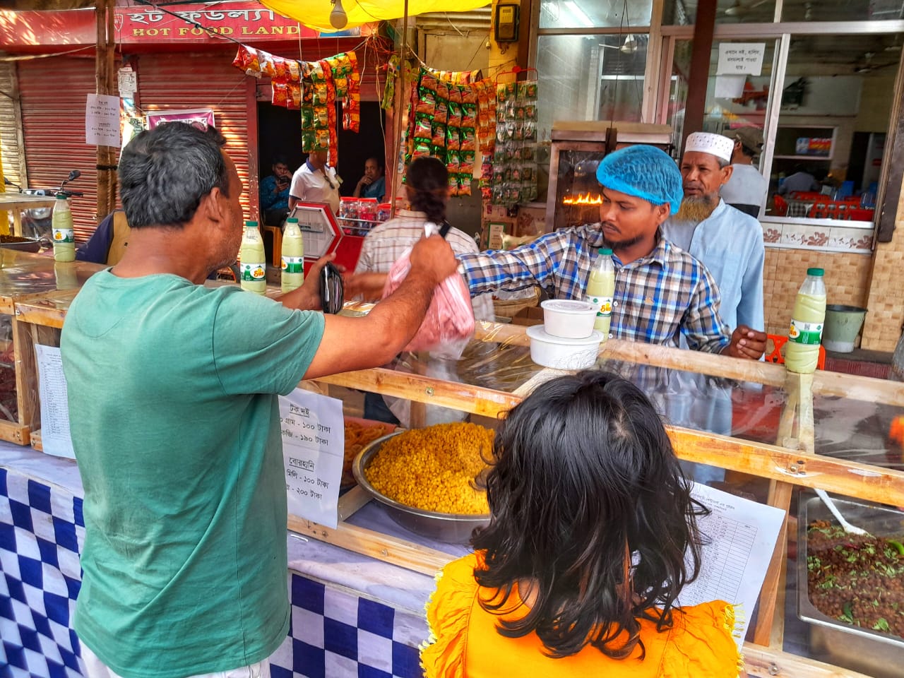 ইফতারের খাবার হিসেবে দেখা মিলেছে হালিমসহ মোটা মোটা জিলাপি, বুট, বুন্দিয়া, পায়েস, ধনিয়া পাতার চপ, গুরের চিকন জিলাপি, বাদাম, ভাজা চিরা, বিরিয়ানি, চিকেন, পরোটা, চিকেন লেগ, চিকেন তন্দুরি, চিকেন কারি, গরু কারি, আস্ত গ্রিল, ছোট মুরগি, বড় মুরগি, কাবাব, টিকা কাবাব, ডিম চপ, রোস্ট, লাচ্ছি, ছোলা, পেঁয়াজু, আলুর চপ, বেগুনি, ফালুদাসহ নানা আইটেম।