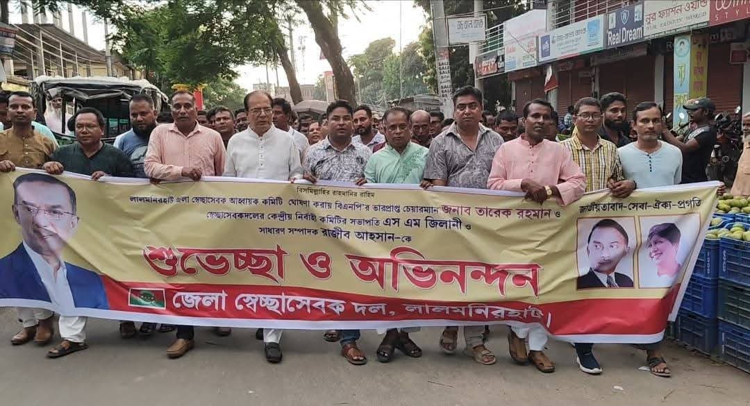লালমনিরহাট জেলা স্বেচ্ছাসেবক দলের আহবায়ক কমিটি ঘোষণা করায় বিএনপি'র ভারপ্রাপ্ত চেয়ারম্যান জনাব তারেক রহমান ও স্বেচ্ছাসেবক দলের কেন্দ্রীয় নির্বাহী কমিটির সভাপতি এস এম জিলানী ও সাধারণ সম্পাদক রাজিব আহসান-কে শুভেচ্ছা ও অভিনন্দন জানিয়ে আনন্দ মিছিল অনুষ্ঠিত হয়েছে।