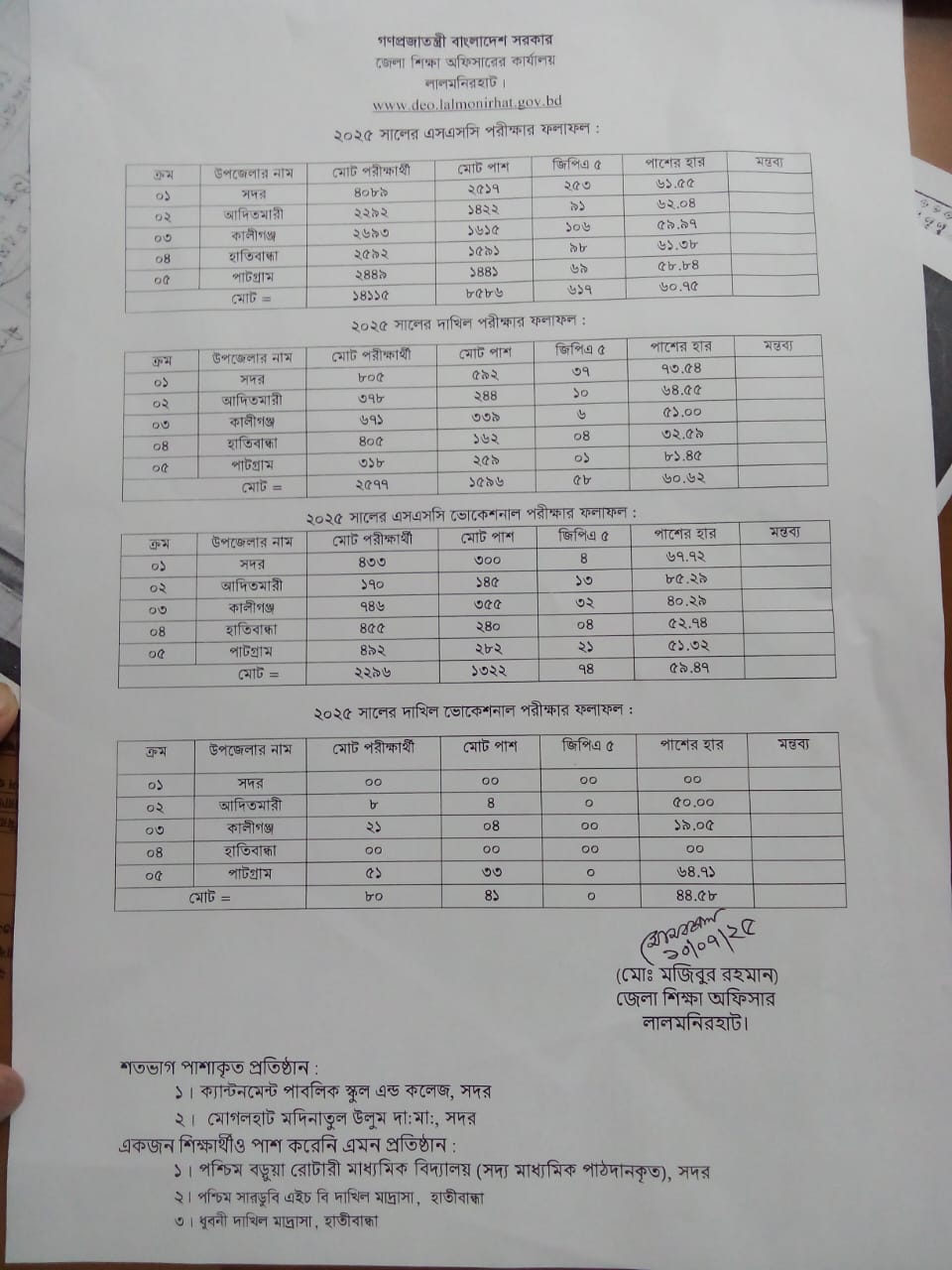 লালমনিরহাটে ২০২৫ সালের এসএসসি, দাখিল, এসএসসি (ভোকেশনাল) ও দাখিল (ভোকেশনাল) পরীক্ষা-২০২৫ এর ফলাফল প্রকাশিত হয়েছে।