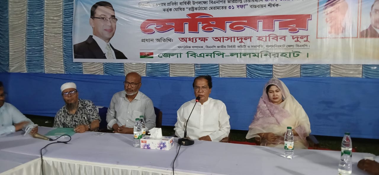 লালমনিরহাটে বিএনপির ৪৭তম প্রতিষ্ঠা বার্ষিকী উপলক্ষ্যে বিএনপির ভারপ্রাপ্ত চেয়ারম্যান জনাব তারেক রহমান কর্তৃক ঘোষিত ''রাষ্ট্রকাঠামো মেরামতের ৩১ দফা" বাস্তবায়ন শীর্ষক সেমিনার অনুষ্ঠিত হয়েছে।
