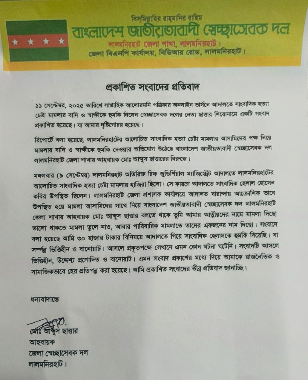 মঙ্গলবার (৯ সেপ্টেম্বর) লালমনিরহাট অতিরিক্ত চিফ জুডিশিয়াল ম্যাজিস্ট্রেট আদালতে লালমনিরহাটের আলোচিত সাংবাদিক হত্যা চেষ্টা মামলার হাজিরা ছিলো। সে কারণে আদালতে সাংবাদিক হেলাল হোসেন কবির উপস্থিত ছিলেন। লালমনিরহাট জেলা প্রশাসক কার্যালয়ে আদালত বারান্দায় আক্রোশিক ভাবে উপস্থিত হয়ে মামলা আসামিদের সাথে নিয়ে বাংলাদেশ জাতীয়তাবাদী স্বেচ্ছাসেবক দল লালমনিরহাট জেলা শাখার আহবায়ক মোঃ আব্দুস ছাত্তার বলতে থাকে তুমি আমার আত্মীয়দের নামে মামলা দিছো ভালো থাকতে মামলা তুলে নাও, আবার পারিবারিক মামলাতে তাদের একজনের নাম দিছো। সংবাদে বলা হয়েছে আমি ৩০ হাজার টাকার বিনিময়ে আদালতে গিয়ে সাংবাদিক হেলালকে হুমকি দিয়েছি। যা সর্ম্পন্ন ভিত্তিহীন ও বানোয়াট। আসলে প্রকৃতপক্ষে সেখানে এমন কোন ঘটনা ঘটেনি। সংবাদটি আসলে ভিত্তিহীন, উদ্দেশ্য প্রণোদিত ও বানোয়াট। এমন সংবাদ প্রকাশের মধ্যে দিয়ে আমাকে রাজনৈতিক ও সামাজিকভাবে হেয় প্রতিপন্ন করা হয়েছে। আমি প্রকাশিত সংবাদের তীব্র প্রতিবাদ জানাচ্ছি।