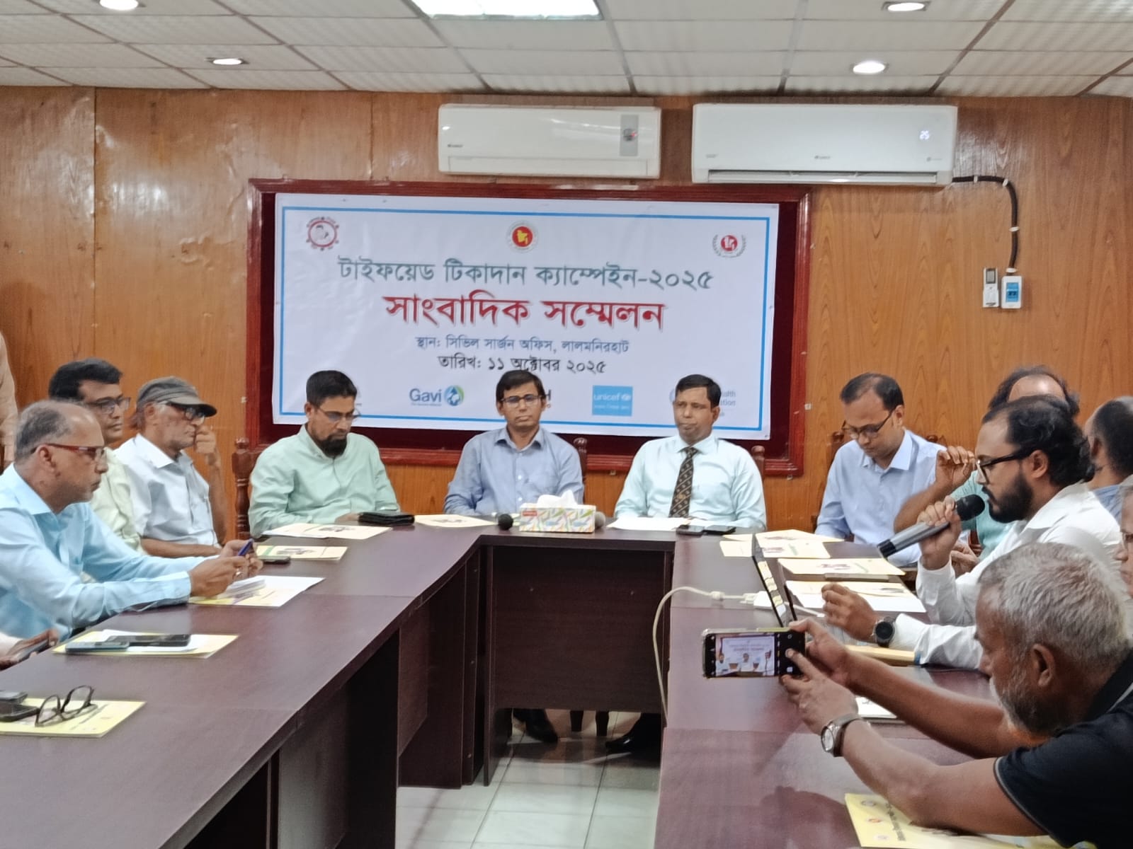 লালমনিরহাটে টাইফয়েড টিকাদান ক্যাম্পেইন-২০২৫ সাংবাদিক সম্মেলন ও "শিশু, কিশোর-কিশোরী ও নারী উন্নয়নে সচেতনতামূলক প্রচার কার্যক্রম” শীর্ষক প্রকল্পের আওতায় ইউনিসেফ বাংলাদেশ এর আর্থিক সহায়তায় টাইফয়েড টিকা বিষয়ক প্রচার কার্যক্রম বাস্তবায়নের লক্ষ্যে মিডিয়া কর্মীদের অংশগ্রহণে কনসালটেশন ওয়ার্কশপ অনুষ্ঠিত হয়েছে।