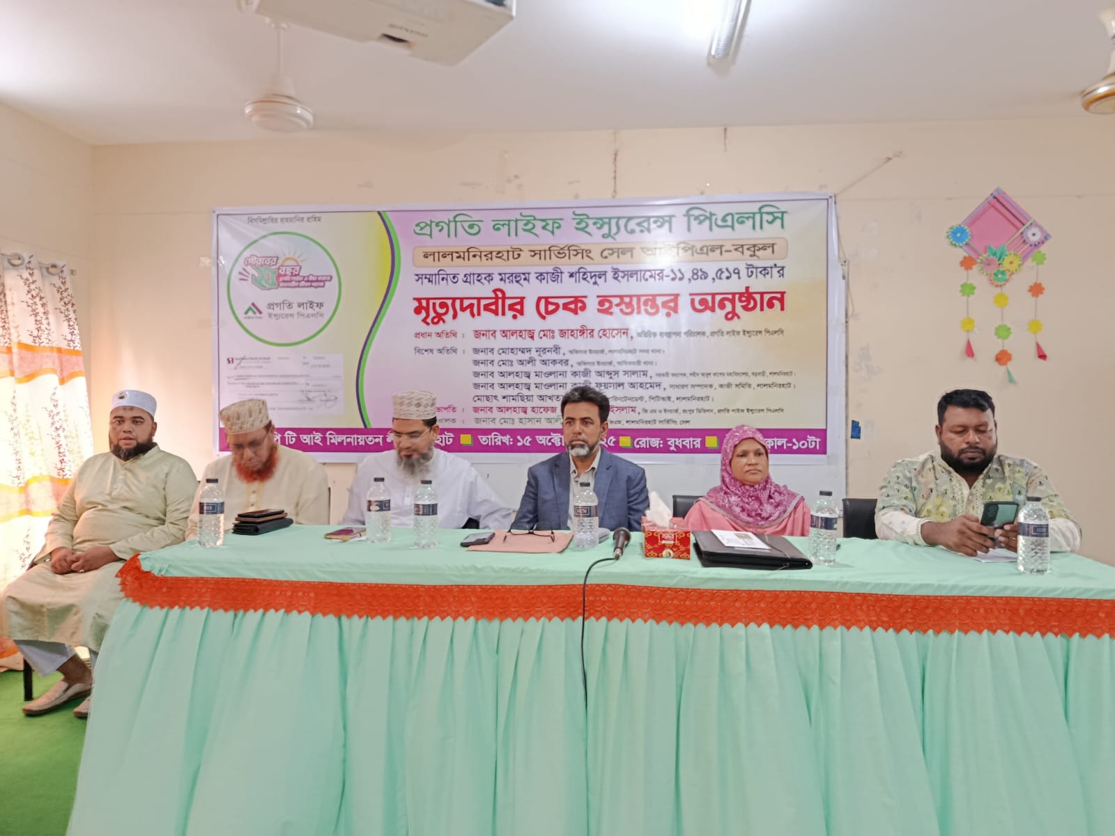 লালমনিরহাটে প্রগতি লাইফ ইন্স্যুরেন্স পিএলসি লালমনিরহাট সার্ভিসিং সেল আইপিএল-বকুল সম্মানিত গ্রাহক মরহুম কাজী শহিদুল ইসলামের-১১,৪৯,৫১৭ টাকা'র মৃত্যুদাবীর চেক হস্তান্তর অনুষ্ঠান অনুষ্ঠিত হয়েছে।