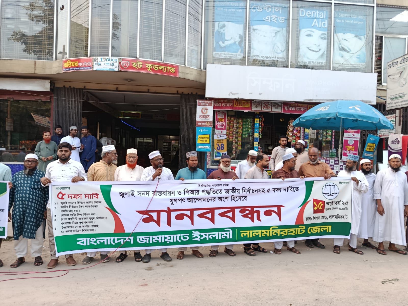 বুধবার (১৫ অক্টোবর) বিকাল ৪টা ৩০মিনিটে লালমনিরহাটের মিশন মোড় চত্ত্বরে বাংলাদেশ জামায়াতে ইসলামী লালমনিরহাট জেলার আয়োজনে এ মানববন্ধন অনুষ্ঠিত হয়।