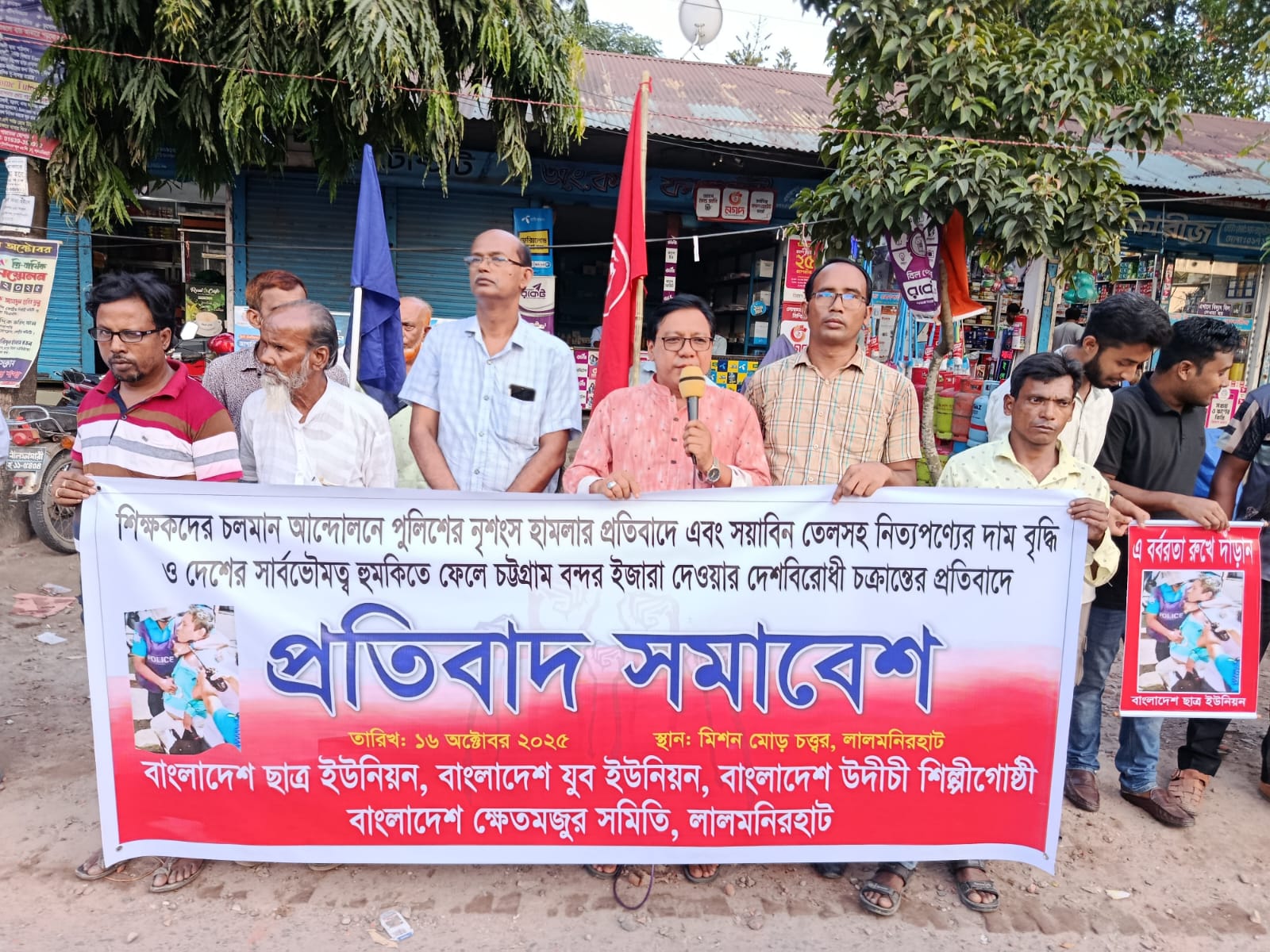 বৃহস্পতিবার (১৬ অক্টোবর) বিকাল ৪টায় লালমনিরহাটের মিশন মোড় চত্ত্বরে বাংলাদেশ ছাত্র ইউনিয়ন, বাংলাদেশ যুব ইউনিয়ন, বাংলাদেশ উদীচী শিল্পীগোষ্ঠী, বাংলাদেশ ক্ষেতমজুর সমিতি লালমনিরহাটের যৌথ আয়োজনে এ প্রতিবাদ সমাবেশ অনুষ্ঠিত হয়।