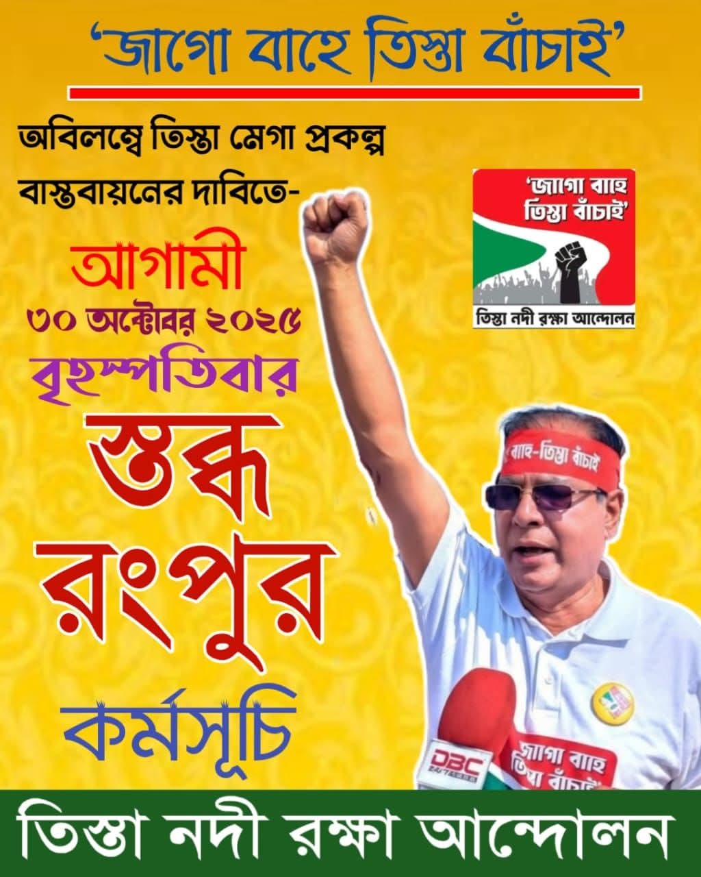 তিনি আরও বলেন, তিস্তা মহাপরিকল্পনা বাস্তবায়নের দাবিতে উত্তরাঞ্চলের মানুষ আজ ঐক্যবদ্ধ। তিস্তা নদী শুধু একটি নদী নয়-এটি আমাদের জীবন, জীবিকা ও সংস্কৃতির প্রতীক। এই নদীর অববাহিকায় বসবাসকারী কোটি মানুষের ভাগ্য জড়িয়ে আছে এর পানির প্রবাহ ও পুনরুজ্জীবনের সঙ্গে।