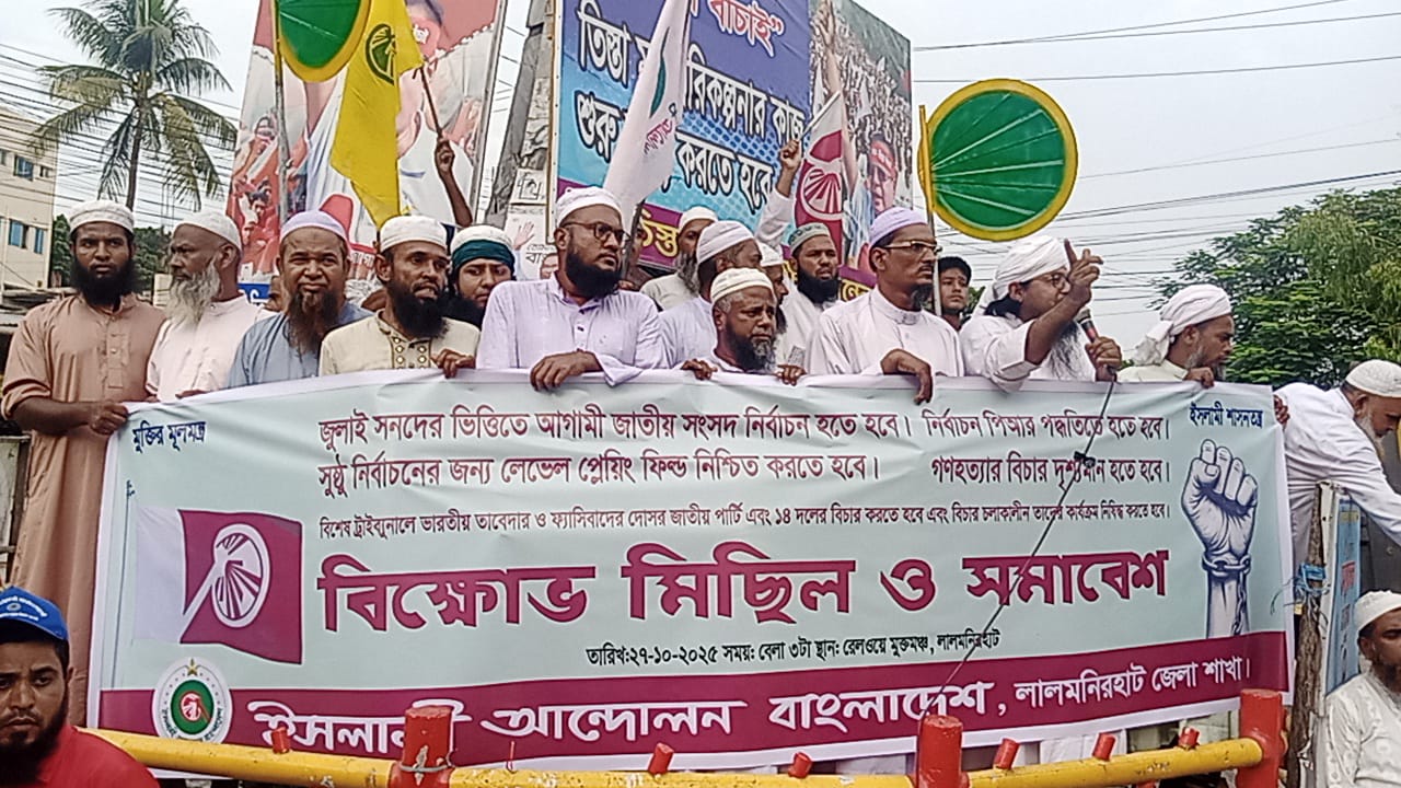 লালমনিরহাটে "মুক্তির মূলমন্ত্র ইসলামী শাসনতন্ত্র" প্রতিপাদ্যকে সামনে রেখে জুলাই সনদের ভিত্তিতে আগামী জাতীয় সংসদ নির্বাচন হতে হবে। সুষ্ঠু নির্বাচনের জন্য লেভেল প্লেয়িং ফিল্ড নিশ্চিত করতে হবে, নির্বাচন পিআর পদ্ধতিতে হতে হবে, সুষ্ঠু নির্বাচনের জন্য লেভেল প্লেয়িং ফিল্ড নিশ্চিত করেতে হবে, গণহত্যার বিচার দৃশ্যমান হতে হবে, বিশেষ ট্রাইব্যুনালে ভারতীয় তাবেদার ও ফ্যাসিবাদের দোসর জাতীয় পার্টি এবং ১৪ দলের বিচার করতে হবে এবং বিচার চলাকালীন তাদের কার্যক্রম নিষিদ্ধ করতে হয় দাবিতে বিক্ষোভ মিছিল ও সমাবেশ অনুষ্ঠিত হয়েছে।