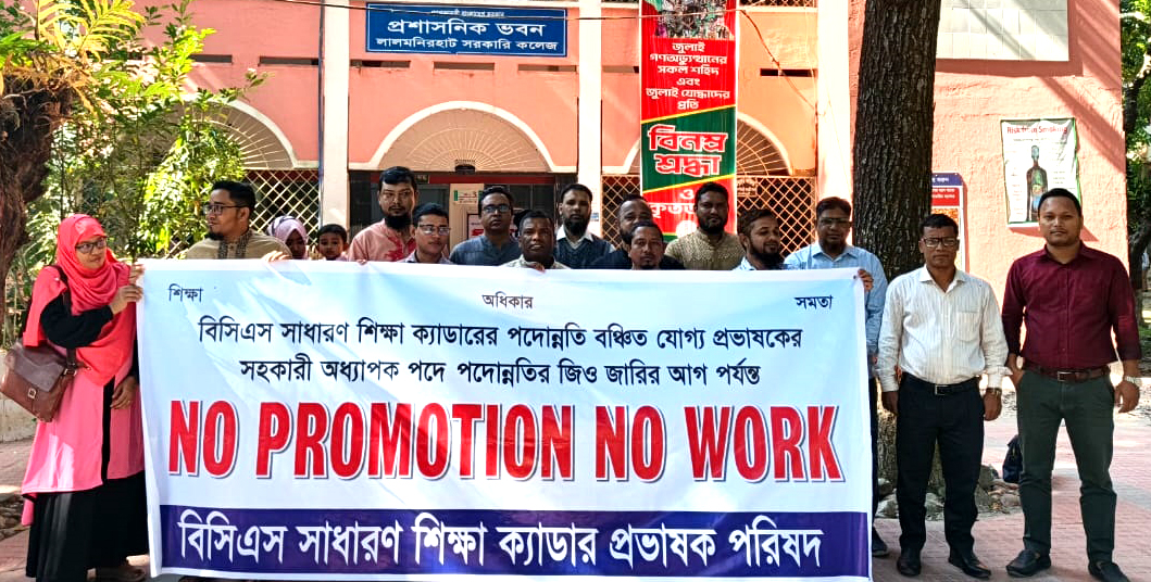 লালমনিরহাটে "শিক্ষা, অধিকার, সমতা" স্লোগান নিয়ে বিসিএস সাধারণ শিক্ষা ক্যাডারের পদোন্নতি বঞ্চিত যোগ্য প্রভাষকের সহকারী অধ্যাপক পদে পদোন্নতির জিও জারির আগ পর্যন্ত নো প্রমোশন নো ওয়ার্ক মানববন্ধন অনুষ্ঠিত হয়েছে।