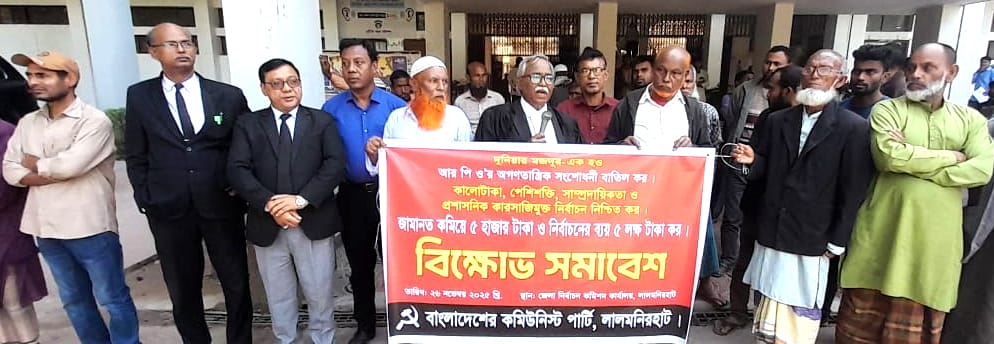 লালমনিরহাটে "দুনিয়ার মজদুর-এক হও" প্রতিপাদ্যকে সামনে রেখে আর পি ও'র অগণতান্ত্রিক সংশোধনী বাতিল কর, কালোটাকা, পেশিশক্তি, সাম্প্রদায়িকতা ও প্রশাসনিক কারসাজি মুক্ত নির্বাচন নিশ্চিত কর, জামানত কমিয়ে ৫ হাজার টাকা ও নির্বাচনের ব্যয় ৫ লক্ষ টাকা কর দাবিতে বিক্ষোভ সমাবেশ অনুষ্ঠিত হয়েছে।