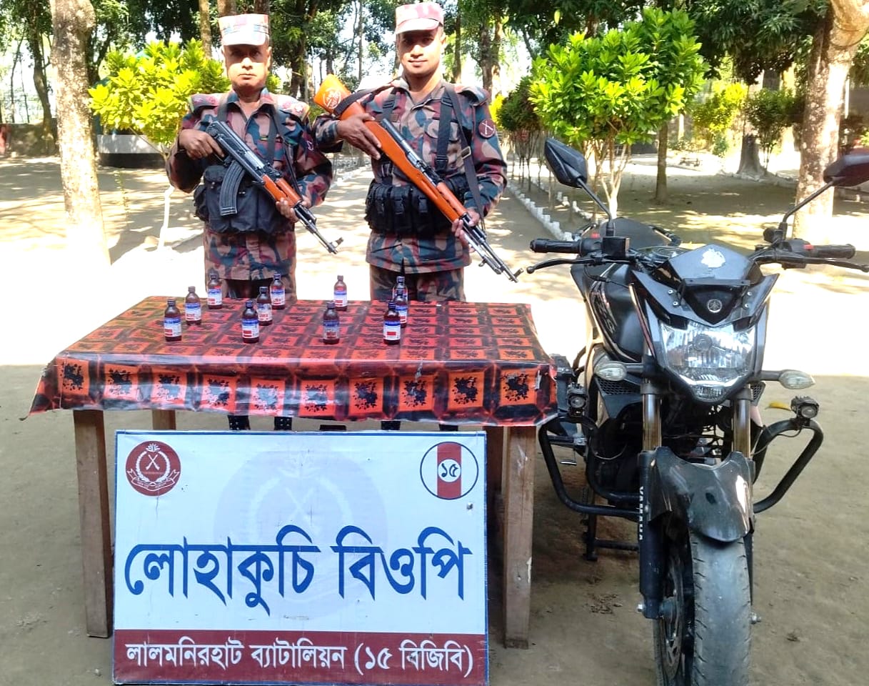 অপরদিকে, বৃহস্পতিবার (২৭ নভেম্বর) রাত আনুমানিক ৯টায় লোহাকুচি বিওপি’র আওতাধীন লালমনিরহাট জেলার কালীগঞ্জ থানার মালগারা এলাকায় টহলদল একজন চোরাকারবারীকে মোটর সাইকেল যোগে আসতে দেখে চ্যালেঞ্জ করলে সে মোটর সাইকেল ফেলে সীমান্ত অতিক্রম করে ভারতের দিকে পালিয়ে যায়। উক্ত মোটর সাইকেল তল্লাশী করে ১১টি বোতল ভারতীয় ইস্কাফ সিরাপসহ মোটর সাইকেলটি জব্দ করা হয়।