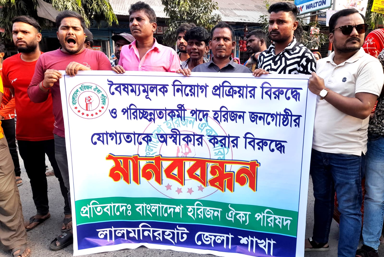 লালমনিরহাট ডিসি অফিসে অগ্রাধিকারের ভিত্তি জাত সুইপার নিয়োগ দাও, কঠিন লিখিত পরীক্ষা পদ্ধতি চালু করে জাত সুইপার কর্মীদের বাতিলের পায়তারা বন্ধ কর, বৈষম্যমূলক নিয়োগ প্রক্রিয়ার বিরুদ্ধে ও পরিচ্ছন্নতাকর্মী পদে হরিজন জনগোষ্ঠীর যোগ্যতাকে অস্বীকার করার বিরুদ্ধে মানববন্ধন অনুষ্ঠিত হয়েছে।