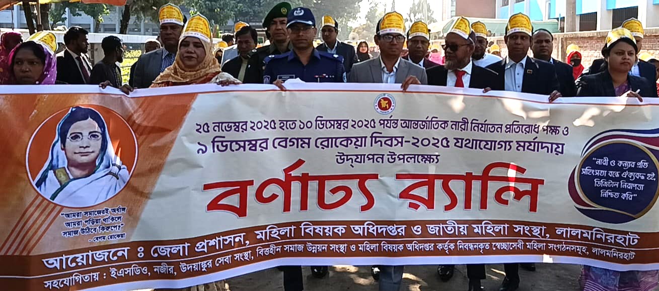 লালমনিরহাটে "নারী ও কন্যার প্রতি সহিংসতা বন্ধে ঐক্যবদ্ধ হই, ডিজিটাল নিরাপত্তা নিশ্চিত করি" প্রতিপাদ্যকে সামনে রেখে আন্তর্জাতিক নারী নির্যাতন প্রতিরোধ পক্ষ ও বেগম রোকেয়া দিবস-২০২৫ উদযাপন উপলক্ষ্যে বর্ণাঢ্য র্যালি, আলোচনা সভা ও অদম্য নারীদের সম্মাননা প্রদান অনুষ্ঠিত হয়েছে।