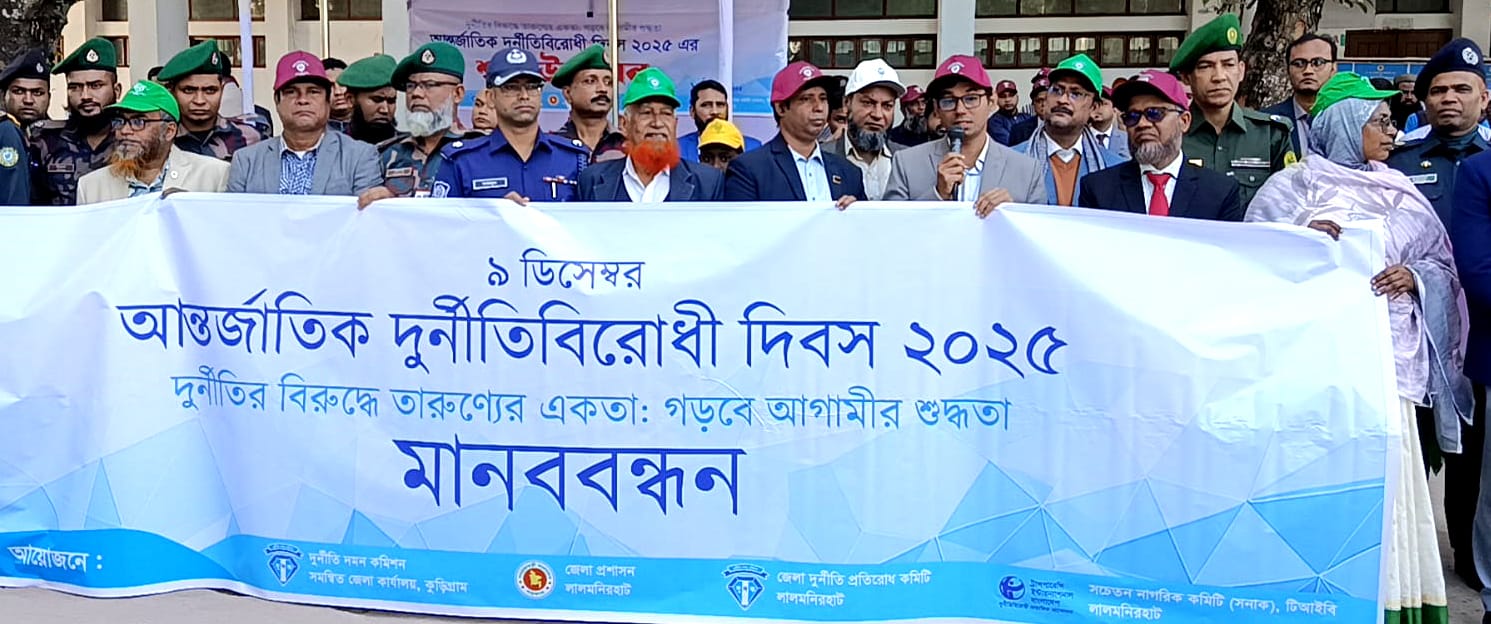 লালমনিরহাটে "দুর্নীতির বিরুদ্ধে তারুণ্যের একতা: গড়বে আগামীর শুদ্ধতা" স্লোগান নিয়ে আন্তর্জাতিক দুর্নীতিবিরোধী দিবস ২০২৫ উদযাপন উপলক্ষে মানববন্ধন ও আলোচনা সভা অনুষ্ঠিত হয়েছে।