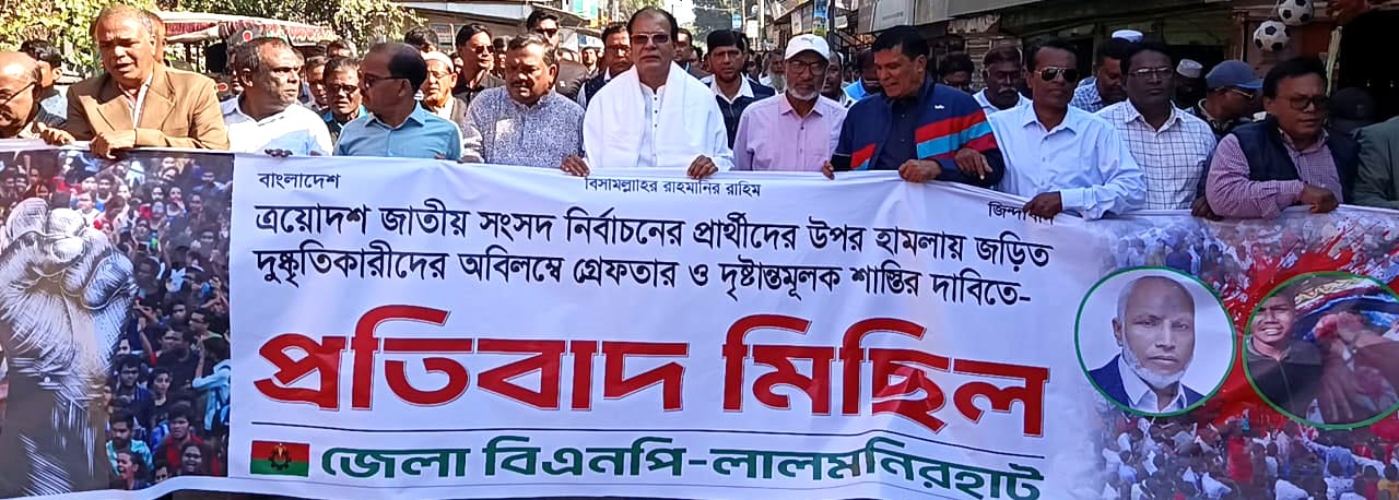 লালমনিরহাটে ত্রয়োদশ জাতীয় সংসদ নির্বাচনের প্রার্থীদের উপর হামলায় জড়িত দুষ্কৃতিকারীদের অবিলম্বে গ্রেফতার ও দৃষ্টান্তমূলক শাস্তির দাবিতে- প্রতিবাদ মিছিল অনুষ্ঠিত হয়েছে।