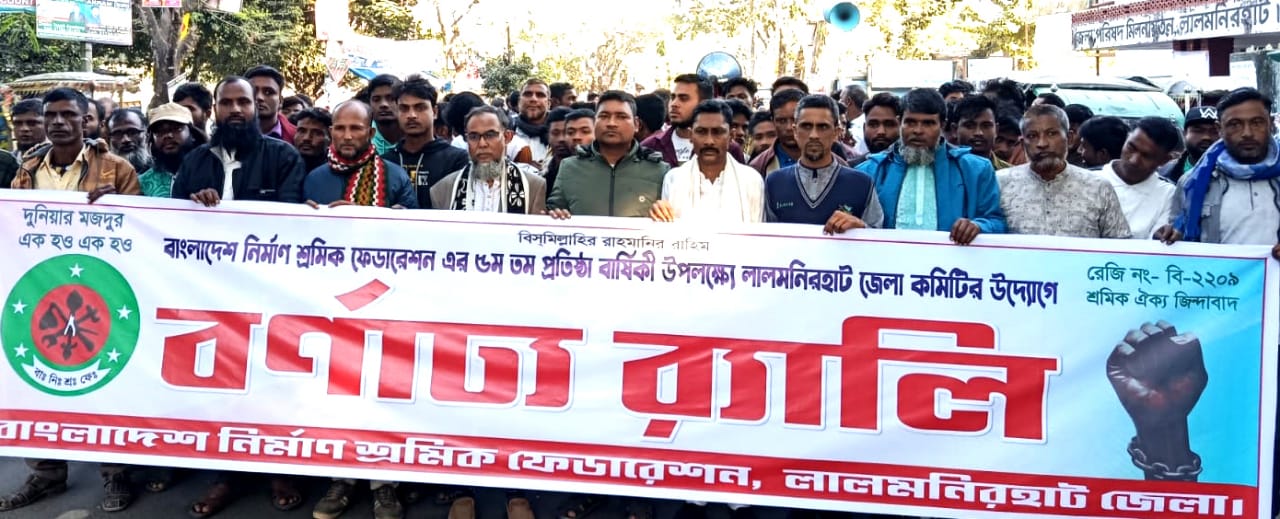 লালমনিরহাটে "দুনিয়ার মজদুর এক হও এক হও, শ্রমিক ঐক্য জিন্দাবাদ" স্লোগান নিয়ে বাংলাদেশ নির্মাণ শ্রমিক ফেডারেশন এর ৫ম তম প্রতিষ্ঠা বার্ষিকী উপলক্ষ্যে বর্ণাঢ্য র্যালি ও আলোচনা সভা অনুষ্ঠিত হয়েছে।