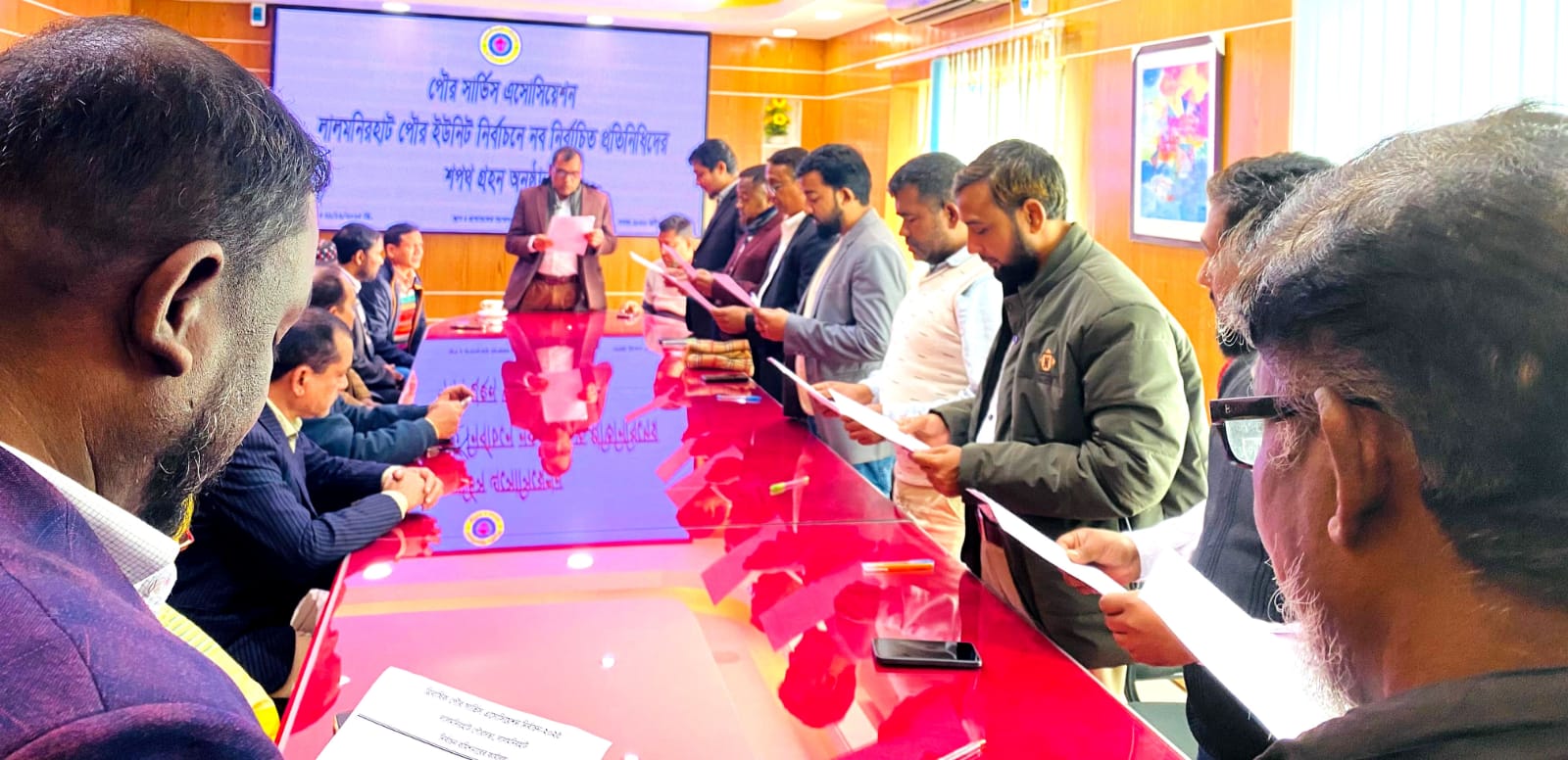 লালমনিরহাটে পৌর সার্ভিস এসোসিয়েশন লালমনিরহাট পৌর ইউনিট নির্বাচনে নব নির্বাচিত প্রতিনিধিদের শপথ গ্রহণ অনুষ্ঠান অনুষ্ঠিত হয়েছে।
