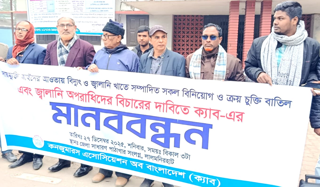 শনিবার (২৭ ডিসেম্বর) বিকাল ৩টা লালমনিরহাট জেলা সাধারণ পাঠাগার সংলগ্ন রোডে কনজুমারস এসোসিয়েশন অব বাংলাদেশ (ক্যাব)র আয়োজনে এ মানববন্ধন অনুষ্ঠিত হয়।