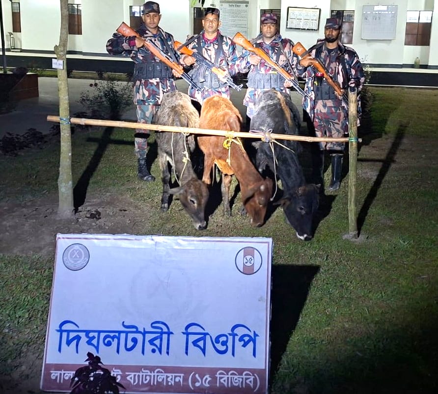 বিশ্বস্ত গোয়েন্দা সূত্রে বিজিবি জানতে পারে যে, চোরাকারবারীরা সীমান্ত দিয়ে গরু পাচার করবে। উক্ত তথ্যানুযায়ী, রোব ও সোমবার (২৮ ও ২৯ ডিসেম্বর) রাতে দিঘলটারী বিওপির আওতাধীন লালমনিরহাট জেলার আদিতমারী থানার যথাক্রমে মাশানকুরা এবং হাজিটারী নামক স্থানে বিজিবি’র টহলদল বিশেষ অভিযান পরিচালনার সময় ভারতীয় সীমান্ত দিক থেকে গরুসহ কয়েকজন চোরাকারবারিকে আসতে দেখে টহলদল তাদেরকে চ্যালেঞ্জ করলে তারা গরু রেখে দৌড়ে ভারতের দিকে পালিয়ে যায়। পরবর্তীতে উক্ত স্থানদ্বয় হতে ৪টি ভারতীয় গরু জব্দ করা হয়।