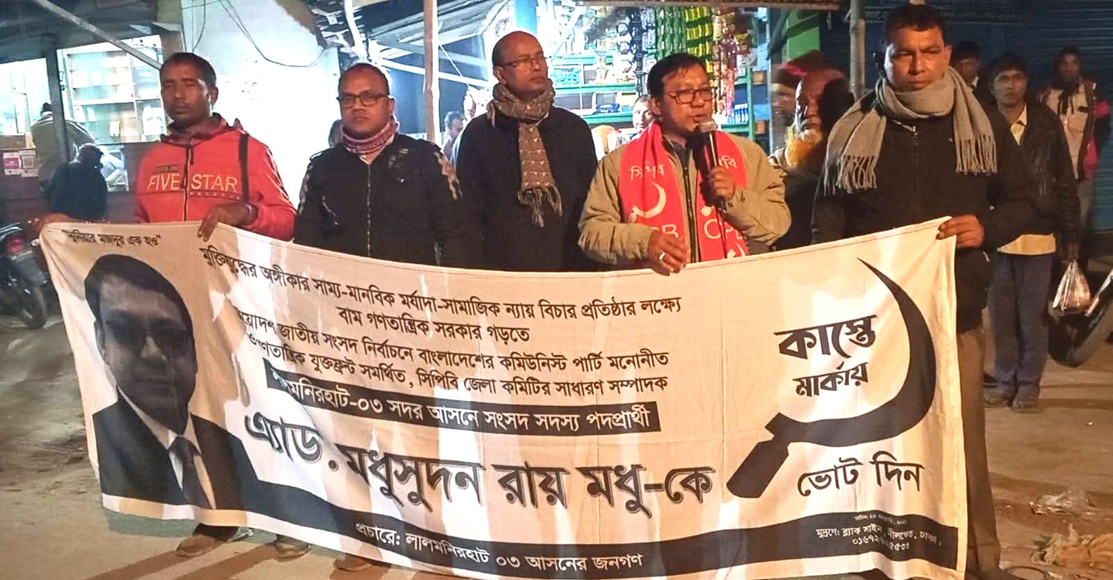 নির্বাচনী প্রচারণায় বাংলাদেশের কমিউনিস্ট পার্টি লালমনিরহাট জেলা কমিটির সাধারণ সম্পাদক ও ১৮, লালমনিরহাট-০৩ (লালমনিরহাট সদর) সংসদীয় আসনের কাস্তে প্রতীকের প্রার্থী এ্যাড. মধু সুদন রায় খেটে-খাওয়া, গরীব-দুঃখী মানুষের কথা বলে যাচ্ছেন। সেই সাথে কৃষক-শ্রমিকদের জন্য ও অবহেলিত মানুষের জন্য কাজ করার প্রতাশায় সকলের কাছে ভোট চেয়ে লালমনিরহাট-০৩ আসনের সর্বত্র চষে বেড়িয়ে প্রচাররণা শেষ করেছে।