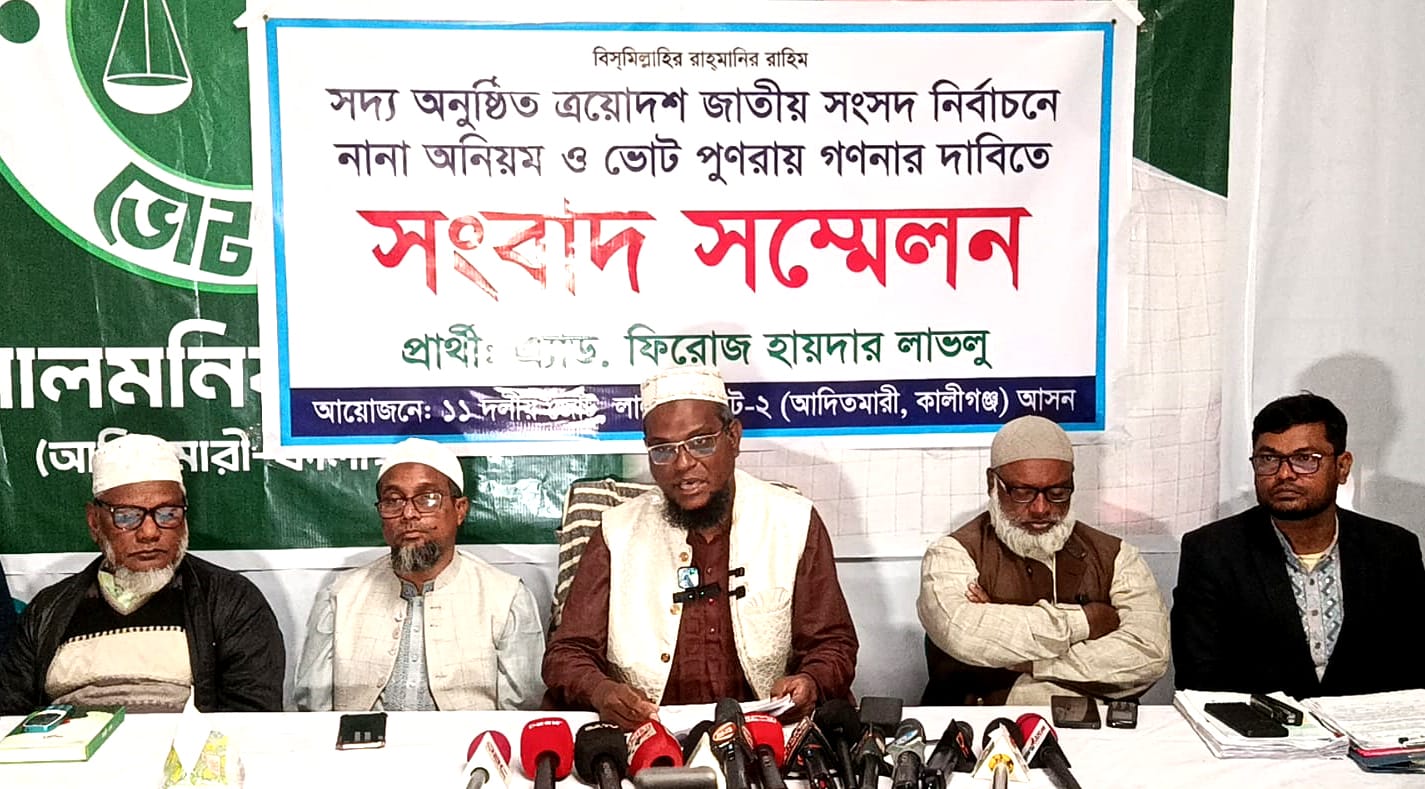 ত্রয়োদশজাতীয় সংসদ নির্বাচনে ১৭, লালমনিরহাট-০২ (কালীগঞ্জ-আদিতমারী) আসনের ১১ দলীয় জোট মনোনীত প্রার্থী অ্যাডভোকেট ফিরোজ হায়দার লাভলু (দাঁড়িপাল্লা) প্রতীকে নির্বাচনের ফলাফল পুনর্মূল্যায়ন ও পূর্ণাঙ্গ ভোট গণনার দাবি জানিয়েছেন। তাকে পরাজিত করতে পরিকল্পিত অনিয়ম করা হয়েছে বলে অভিযোগ তুলে তিনি সুষ্ঠু তদন্ত ও প্রকৃত ফল প্রকাশের আহ্বান জানান।
