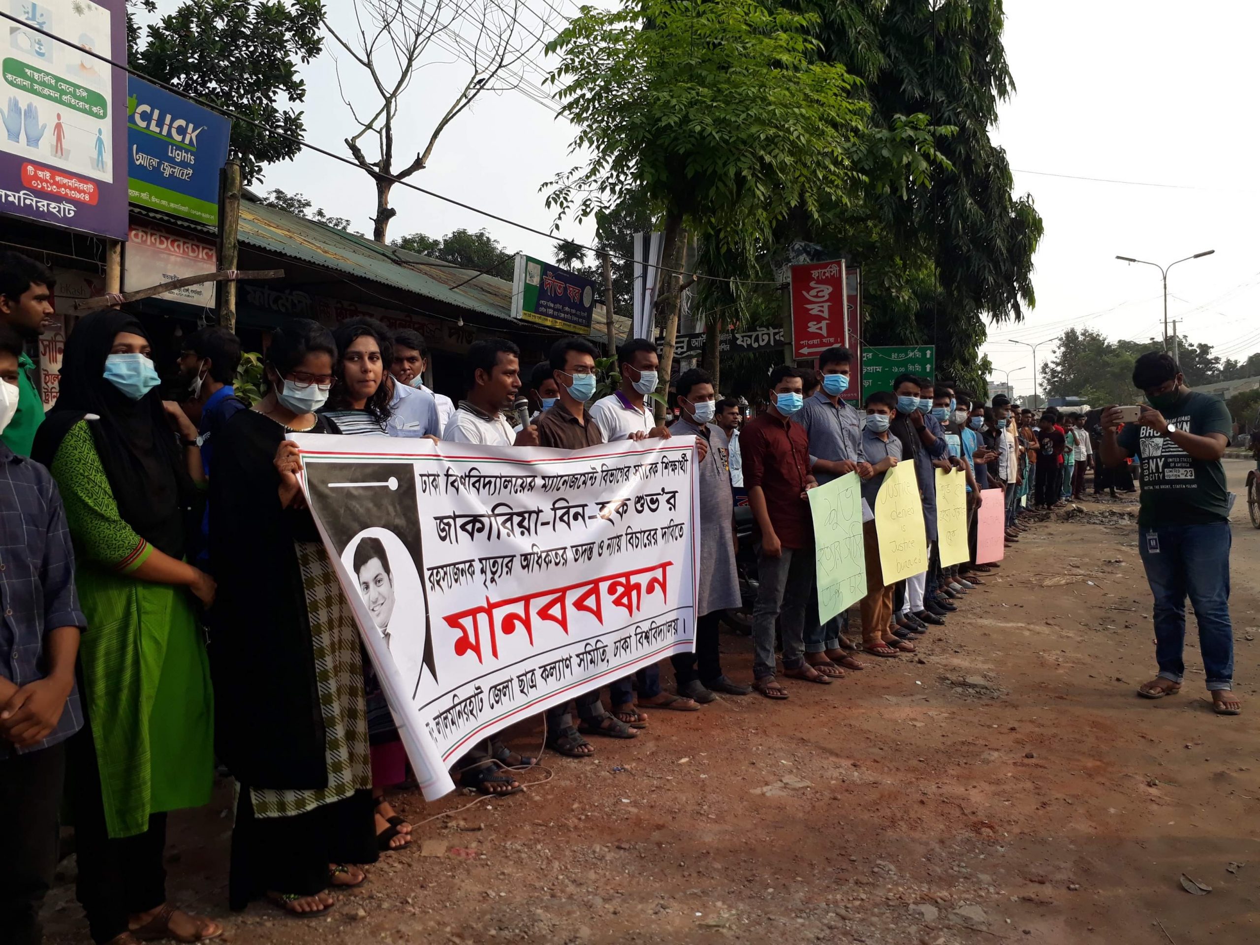 ঢাবি লালমনিরহাট ছাত্র কল্যাণ সমিতির সাবেক সভাপতি মনিরুজ্জামান মানিক শেটের সভাপতিত্বে মানববন্ধনে বক্তব্য রাখেন ঢাবি ছাত্র মৈত্রীর সাবেক সভাপতি মাসুদ মাজহার, ঢাবি লালমনিরহাট ছাত্র কল্যাণ সমিতির সহসভাপতি-তারিকুল ইসলাম তুহিন, সাধারণ সম্পাদক নাসিফ ইনতেসাফ, যুগ্ম সাধারণ সম্পাদক মনিরা মিনা, স্থানীয় সাংস্কৃতিক ও সংবাদকর্মী হেলাল হোসেন কবীর, নিহত জাকারিয়া বিন হক শুভ’র বড় ভাই আজাদ জিন্নাতুল হাসান লেবু ও তার মামা খলিলুর রহমান প্রমূখ।