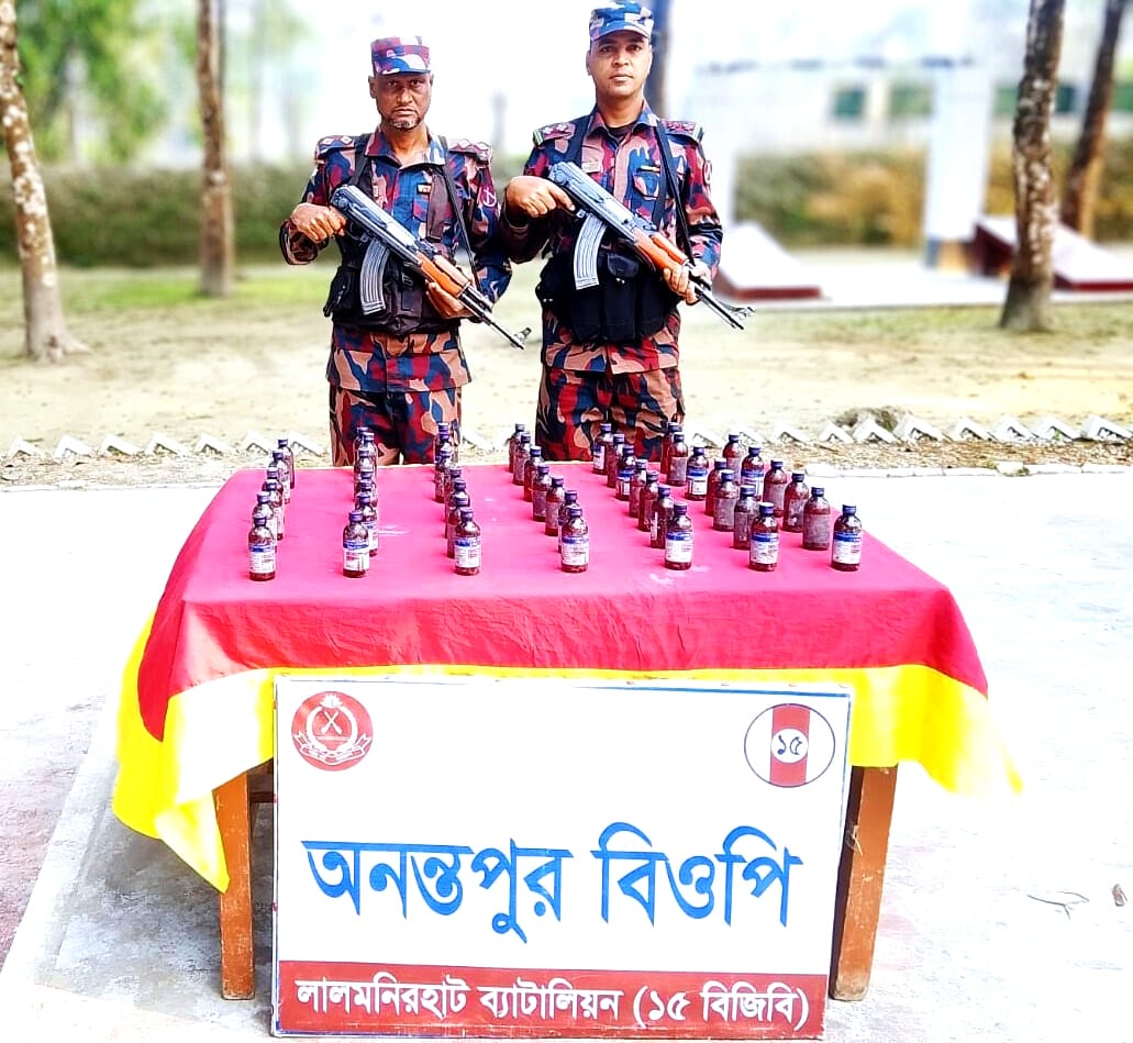 লালমনিরহাট ব্যাটালিয়ন (১৫ বিজিবি) এর দায়িত্বপূর্ণ সীমান্ত এলাকায় চলমান গোয়েন্দা তথ্য ভিত্তিক চোরাচালান ও মাদক বিরোধী অভিযানের অংশ হিসেবে অনন্তপুর বিওপির বিশেষ টহলদল অভিযান পরিচালনা করে ভারতীয় ইস্কাফ সিরাপ জব্দ করেছে।