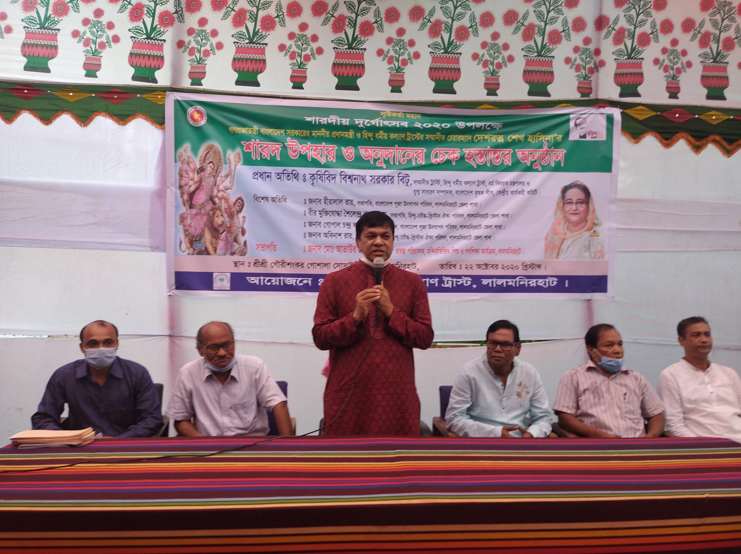 আলোর মনি ডটকম ডেস্ক রিপোর্ট: আজ বৃহস্পতিবার (২২ অক্টোবর) শ্রী শ্রী গৌরী শংকর গোশালা সোসাইটি চত্ত্বরে হিন্দু ধর্মীয় কল্যাণ ট্রাস্ট লালমনিরহাটের আয়োজনে শারদীয় দুর্গোৎসব ২০২০ উপলক্ষে গণপ্রজাতন্ত্রী বাংলাদেশ সরকারের মাননীয় প্রধানমন্ত্রী ও হিন্দু ধর্মীয় কল্যাণ ট্রাস্টের সম্মানীত চেয়ারম্যান দেশরত্ন শেখ হাসিনা'র শারদ উপহার ও অনুদানের চেক হস্তান্তর অনুষ্ঠান অনুষ্ঠিত হয়।