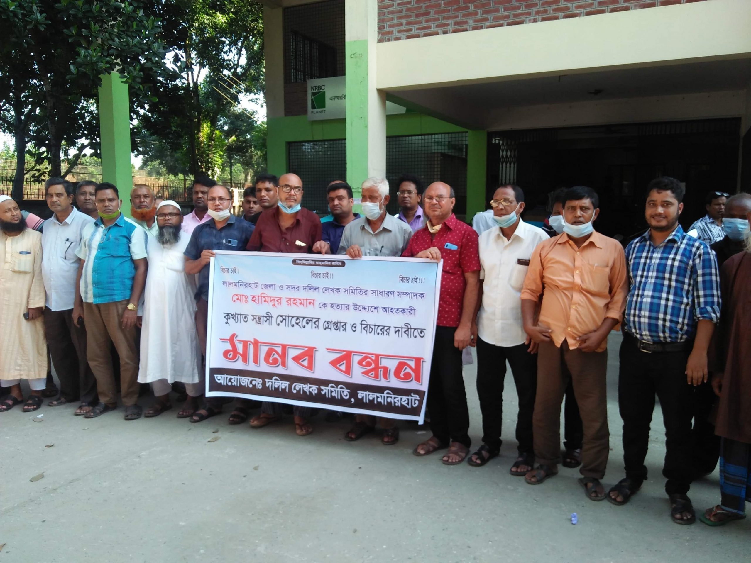 লালমনিরহাট জেলা সাব-রেজিষ্ট্রি অফিসের সামনে এক ঘন্টা ব্যাপী মানববন্ধনে এ সময় সন্ত্রাসী ও মাদক কারবারী সোহেলকে ২৪ঘন্টার মধ্যে গ্রেফতার করে দৃষ্টান্তমূলক শাস্তি দাবী করে বক্তব্য রাখেন দলিল লেখক সমিতির সভাপতি মোঃ আবু বক্কর সিদ্দিক, কোষাধ্যক্ষ এস এম শফিকুল ইসলাম লিখন প্রমুখ।