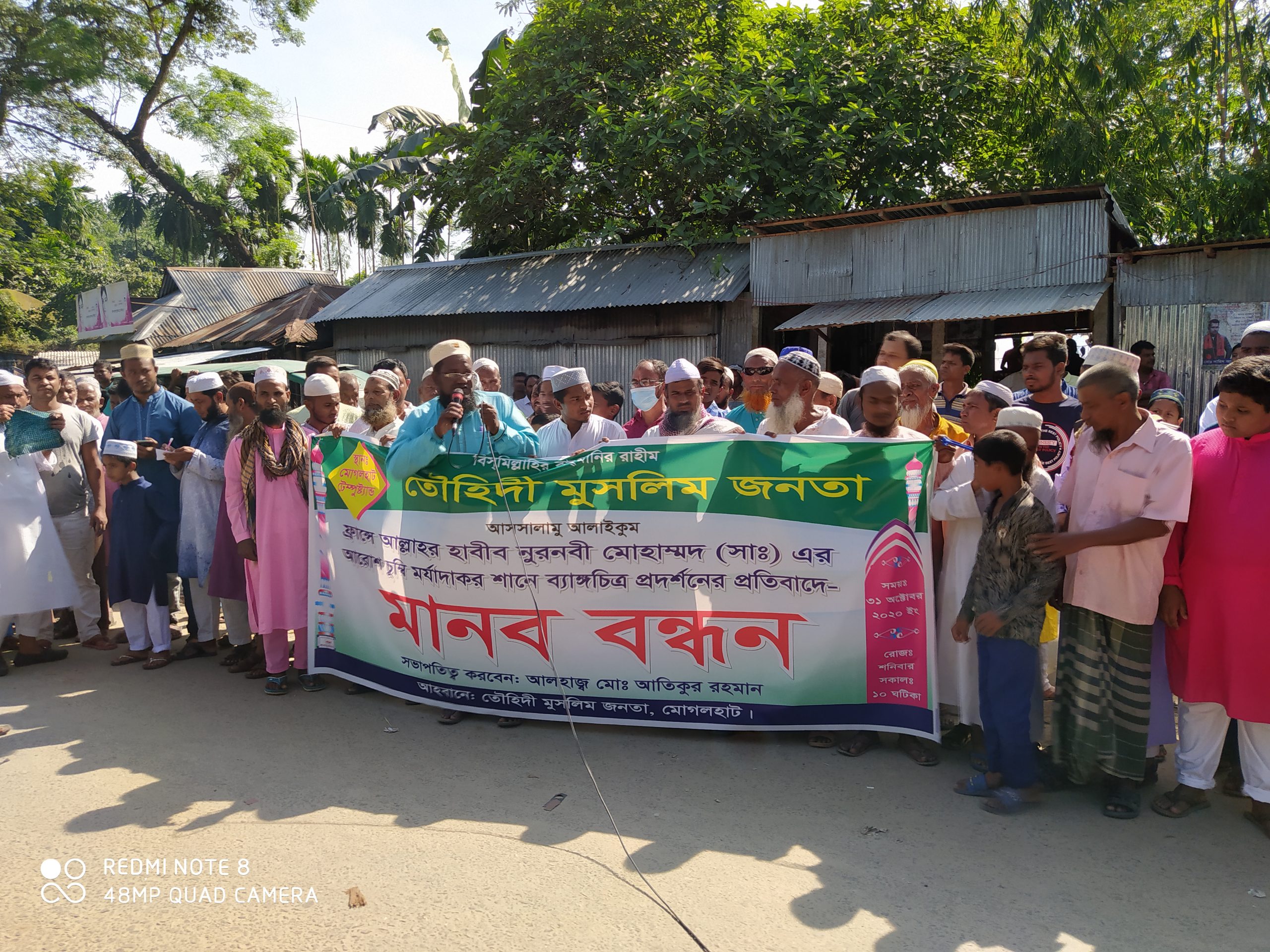 আলোর মনি ডটকম ডেস্ক রিপোর্ট: আজ শনিবার (৩১ অক্টোবর) সকাল ১০টায় লালমনিরহাট জেলার লালমনিরহাট সদর উপজেলার মোগলহাট ইউনিয়নের মোগলহাট টেম্পু স্ট্যান্ডে মোগলহাট তৌহিদী মুসলিম জনতার আহবানে ফ্রান্সে আল্লাহর হাবীব নুরনবী মোহাম্মদ (সাঃ) এর আরোশ চুম্বি মর্যাদাকর শানে ব্যাঙ্গচিত্র প্রদর্শনের প্রতিবাদে- মানববন্ধন অনুষ্ঠিত হয়।
