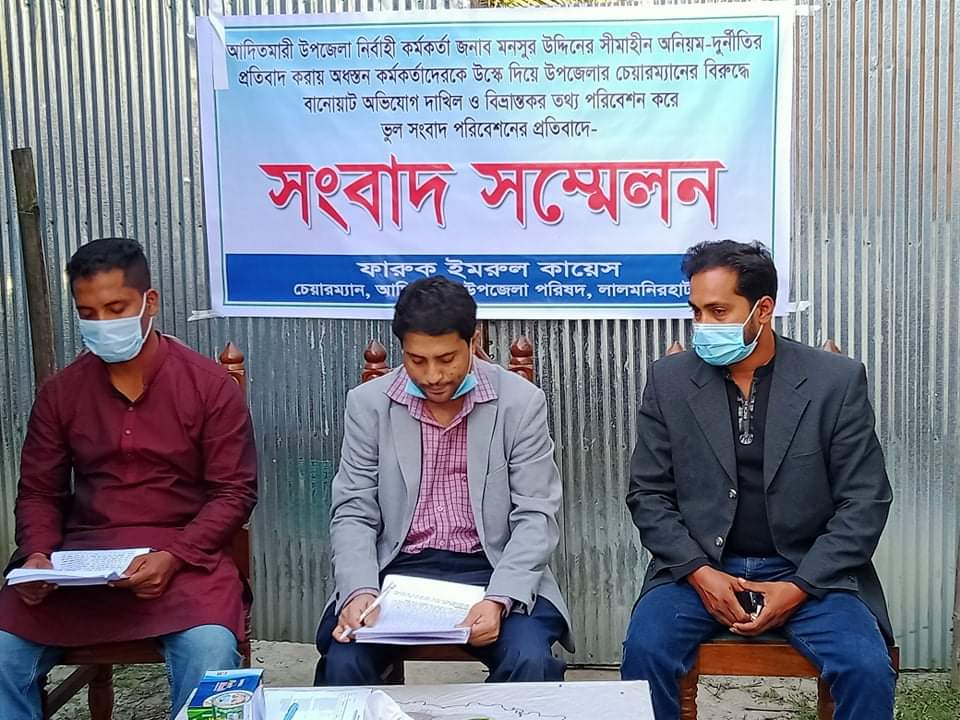 আলোর মনি ডটকম ডেস্ক রিপোর্ট: গত বৃহস্পতিবার সন্ধায় হঠাৎ অাদিতমারী ইউএনওসহ ১৮জন কর্মকর্তা জেলা প্রশাসকের দপ্তরে তাদের লাঞ্চিত করার লিখিত অভিযোগ করেন। যা সংবাদ সম্মেলন করে ভিত্তিহীন অভিযোগ বলে দাবি করেন উপজেলা চেয়ারম্যান ফারুক ইমরুল কায়েস।