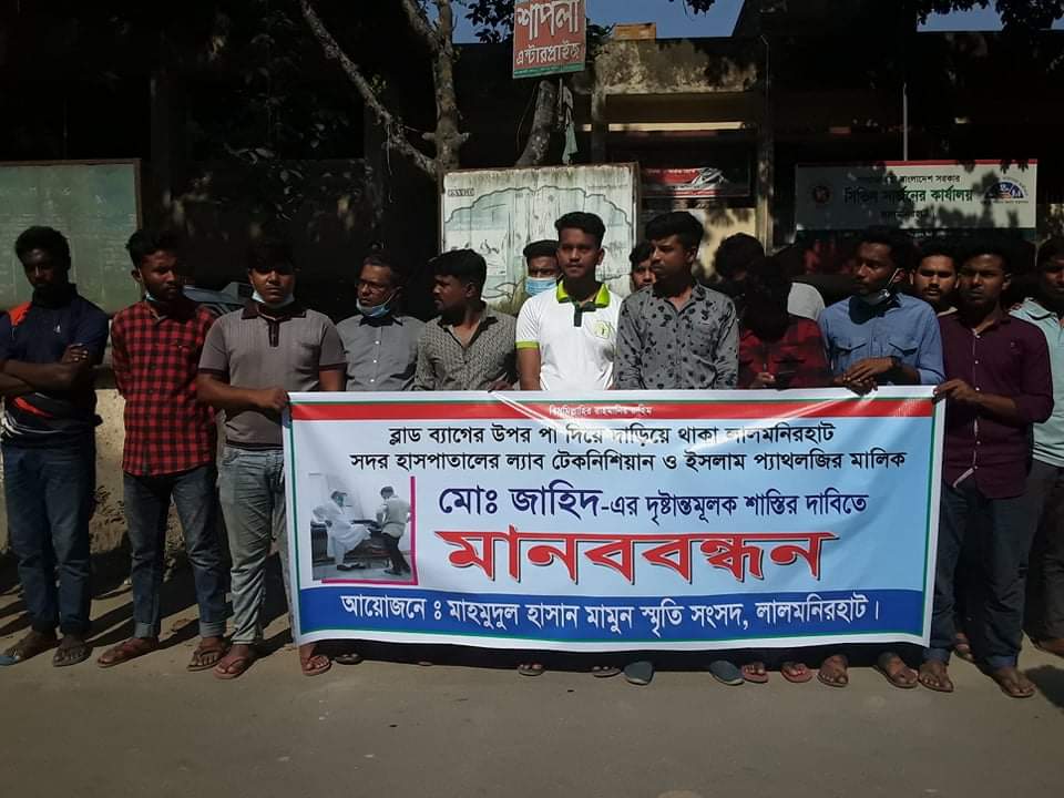 আলোর মনি ডটকম ডেস্ক রিপোর্ট: আজ বুধবার (১৮ নভেম্বর) দুপুর ১২টায় লালমনিরহাট সিভিল সার্জনের কার্যালয়ের সামনে মাহমুদুল হাসান মামুন স্মৃতি সংসদের আয়োজনে ব্লাড ব্যাগের উপর পা দিয়ে দাড়িয়ে থাকা লালমনিরহাট সদর হাসপাতালের ল্যাব টেকনিশিয়ান ও ইসলাম প্যাথলজির মালিক মোঃ জাহিদ-এর দৃষ্টান্তমূলক শাস্তির দাবিতে মানববন্ধন অনুষ্ঠিত হয়।