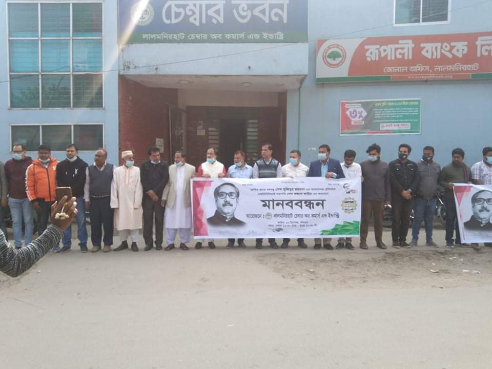 লালমনিরহাট চেম্বার অব কমার্স এন্ড ইন্ডাস্ট্রির সভাপতি সিরাজুল হক বলেন, এফবিসিসিআই সভাপতি শেখ ফজলে ফাহিম এর আহবানে আজকের মানববন্ধনে দাড়িয়েছি জাতির জনক বঙ্গবন্ধু শেখ মুজিবুর রহমান এর ভাস্কর্যে যারা আঘাত হেনেছে তাদের প্রত্যেককে আইনের আওতায় এনে দ্রুত বিচার কার্যক্রম সম্পূর্ণ করতে হবে।
