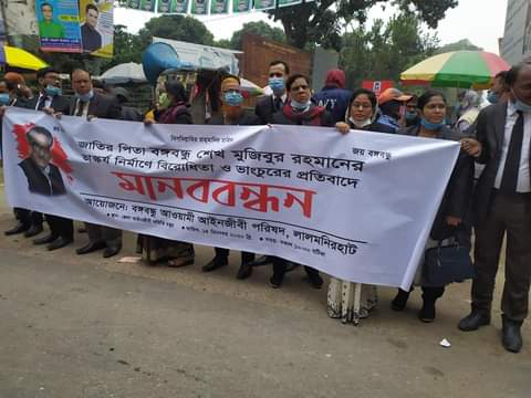 আলোর মনি ডটকম ডেস্ক রিপোর্ট: আজ সোমবার (১৪ ডিসেম্বর) সকাল ১০টায় লালমনিরহাট জেলা আইনজীবী সমিতি চত্ত্বরে বঙ্গবন্ধু আওয়ামী আইনজীবী পরিষদ লালমনিরহাটের আয়োজনে জাতির পিতা বঙ্গবন্ধু শেখ মুজিবুর রহমানের ভাস্কর্য নির্মাণে বিরোধিতা ও ভাংচুরের প্রতিবাদে মানববন্ধন অনুষ্ঠিত হয়।